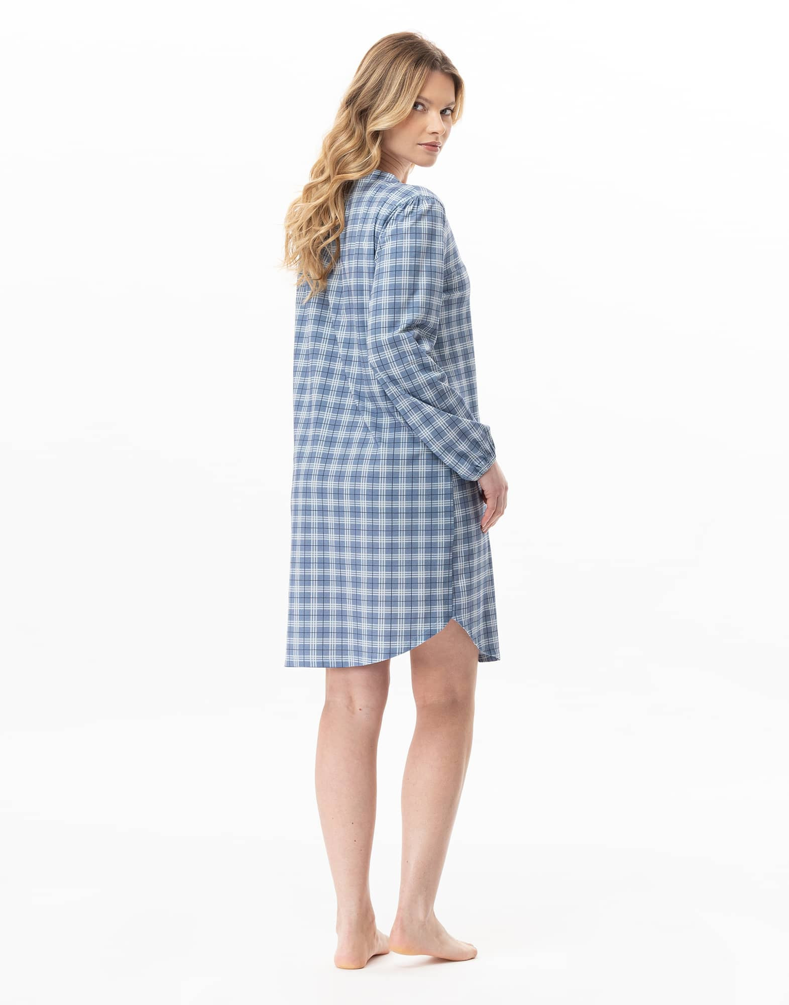 Its blue check print gives a nod to classic borrowed shirts — effortlessly cool, in a cocooning version.