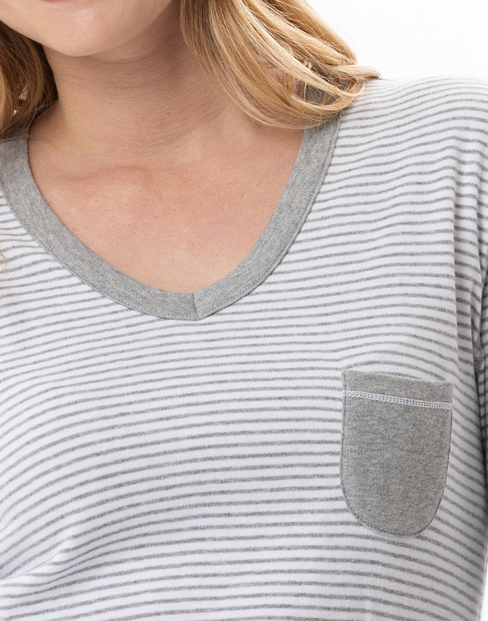 - Contrasting heather grey finishes: trim on the rounded V-neckline, small chest pocket, and wide cuffs on the long sleeves.