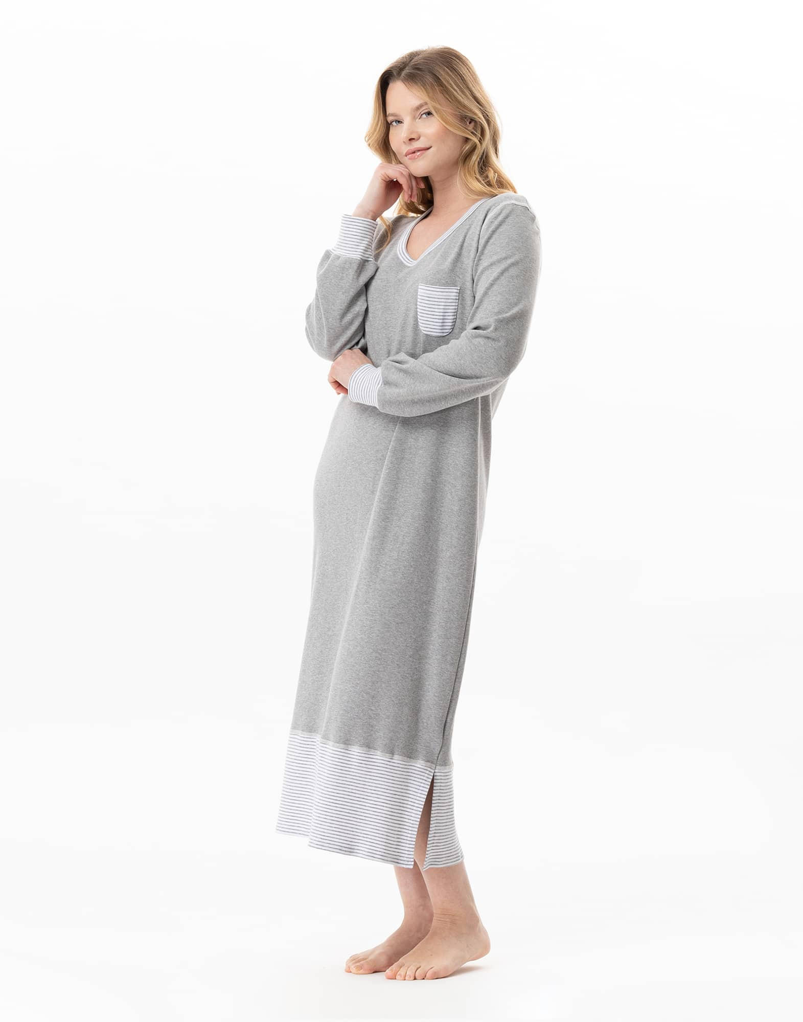 Its length keeps you warm throughout the night, while the two side slits allow complete freedom of movement. With its fluid cut and relaxed drape, it ticks all the boxes for the perfect nightwear essential: comfortable, practical, modern.