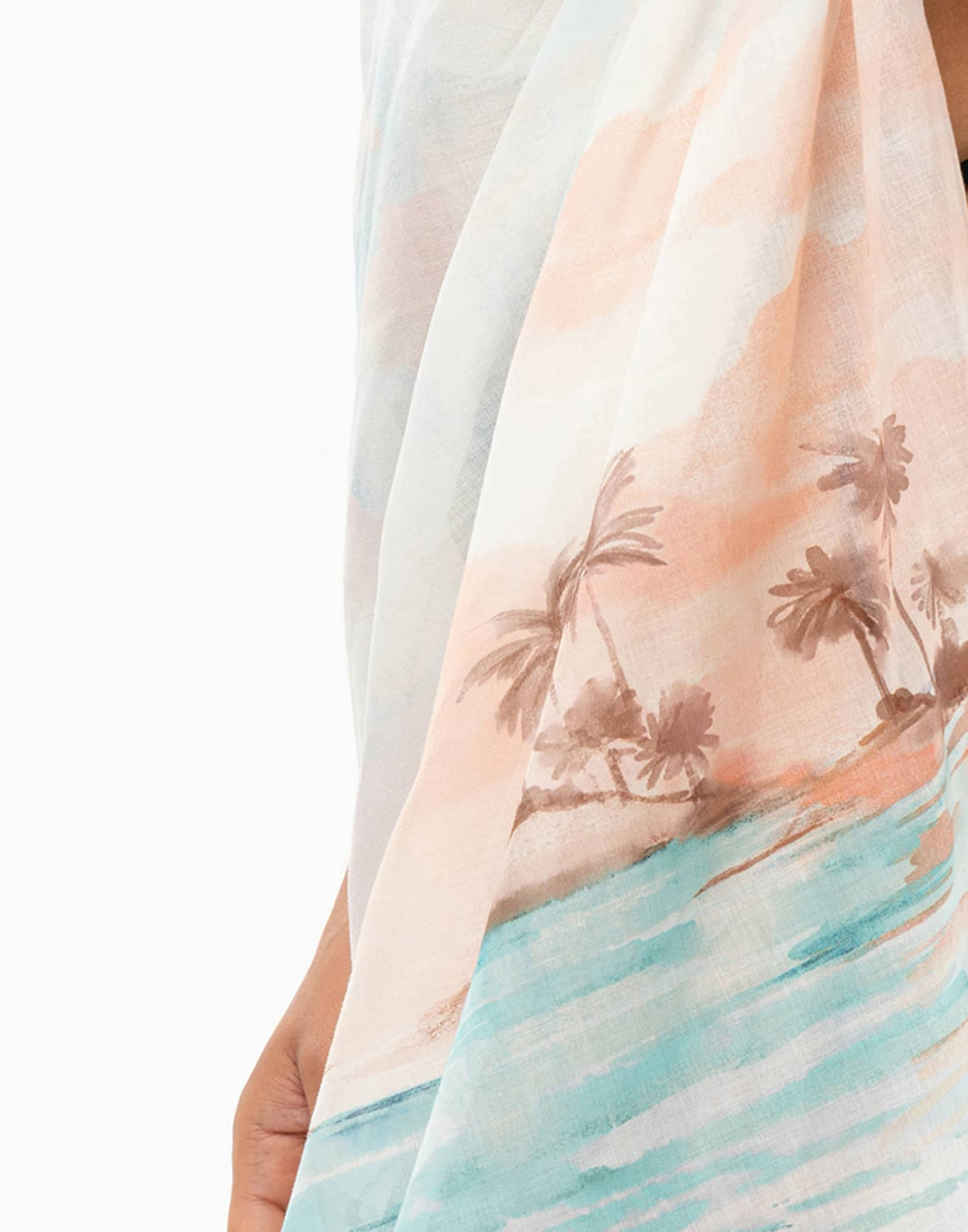 Its cotton voile fabric, made in France, reveals palm trees by the sea in a landscape tinged with pink at sunset, evoking those late summer days between the last swim and the gentle evening breeze.