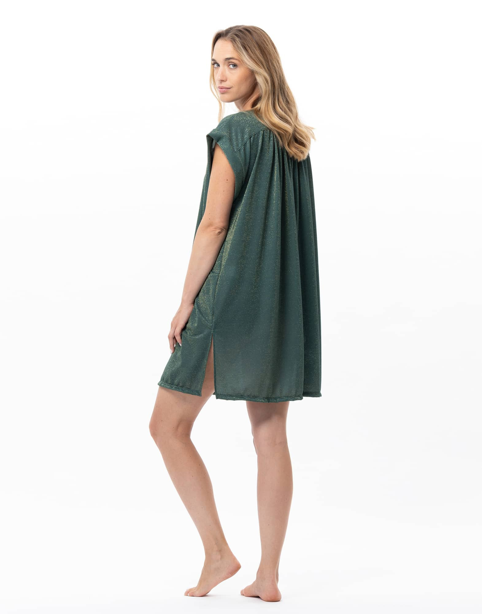 Anticipate, enjoy or prolong the warmth of summer days with the Coco kaftan. Made in Italy, its knit stands out for its subtle iridescent sheen created by fine Lurex® threads that catch the light. In vibrant apricot or vegetable khaki, it is an easy-to-wear piece, ideal as a cover-up over a swimsuit or paired with Coco trousers for a contemporary look.