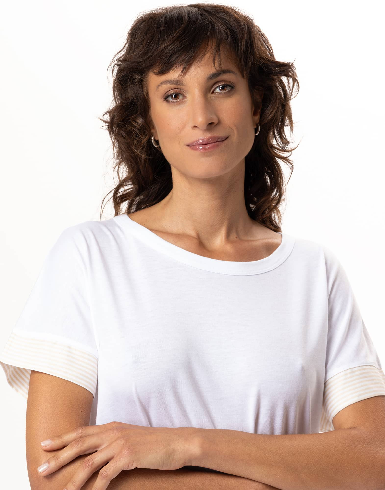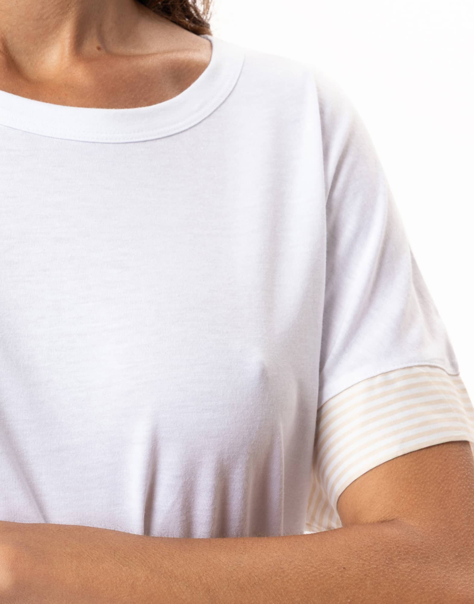 Available in two mix & match combinations. The heather grey cotton-modal with sky blue cotton satin stripes offers a fresh look with a hint of sporty style. Another summer option: white jersey paired with beige woven stripes. Striped cotton satin details accentuate the intentionally loose fit of the T-shirt.
