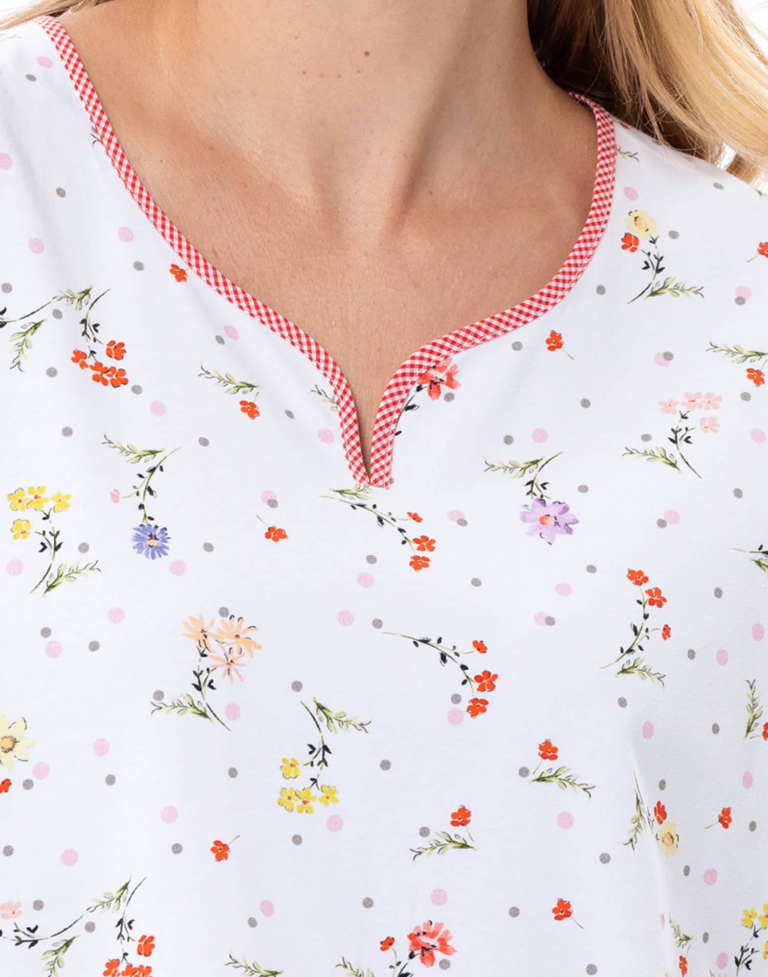 - Mini Vichy check binding at the Tunisian neckline