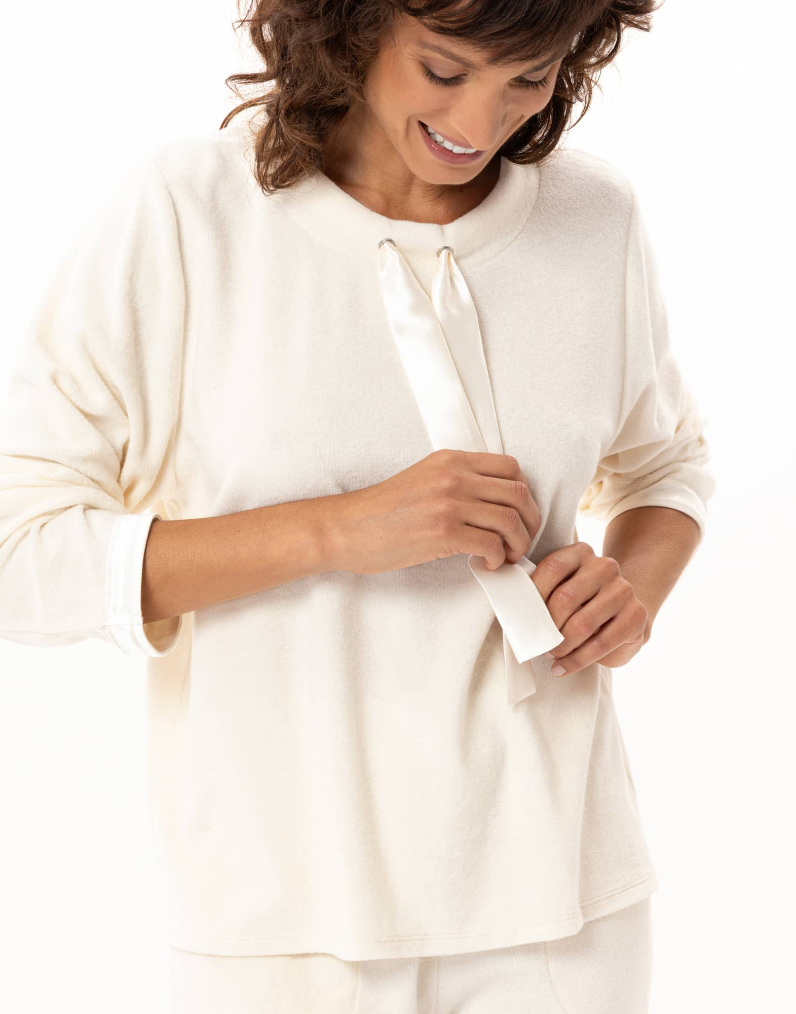 The long-sleeve top of the Gelato homewear set stands out with its satin ribbon at the neckline — a signature detail that structures the look while bringing elegance to its casual spirit. Paired with the elasticated-waist trousers, the silhouette is easy to wear from morning to evening, at home or on getaway.