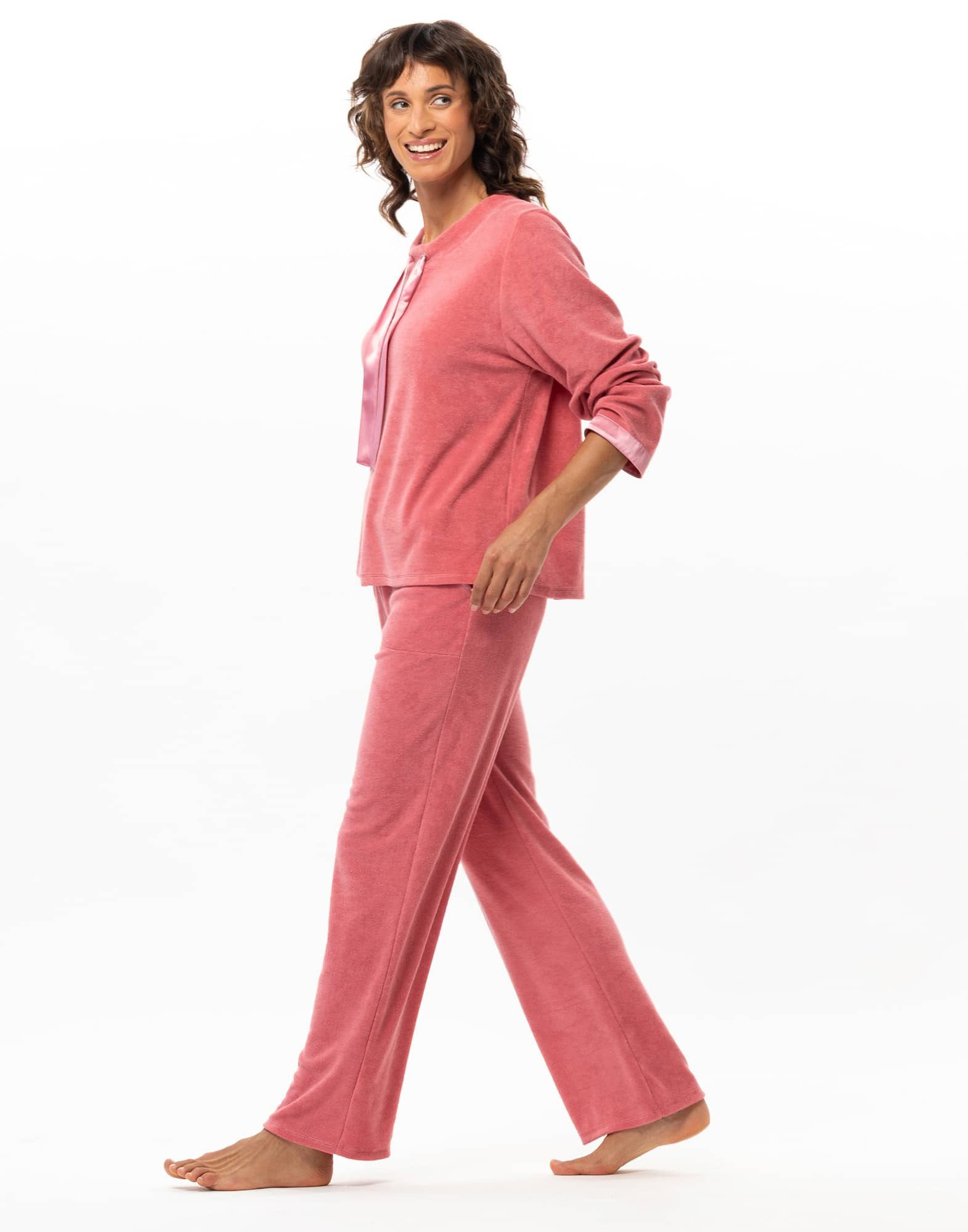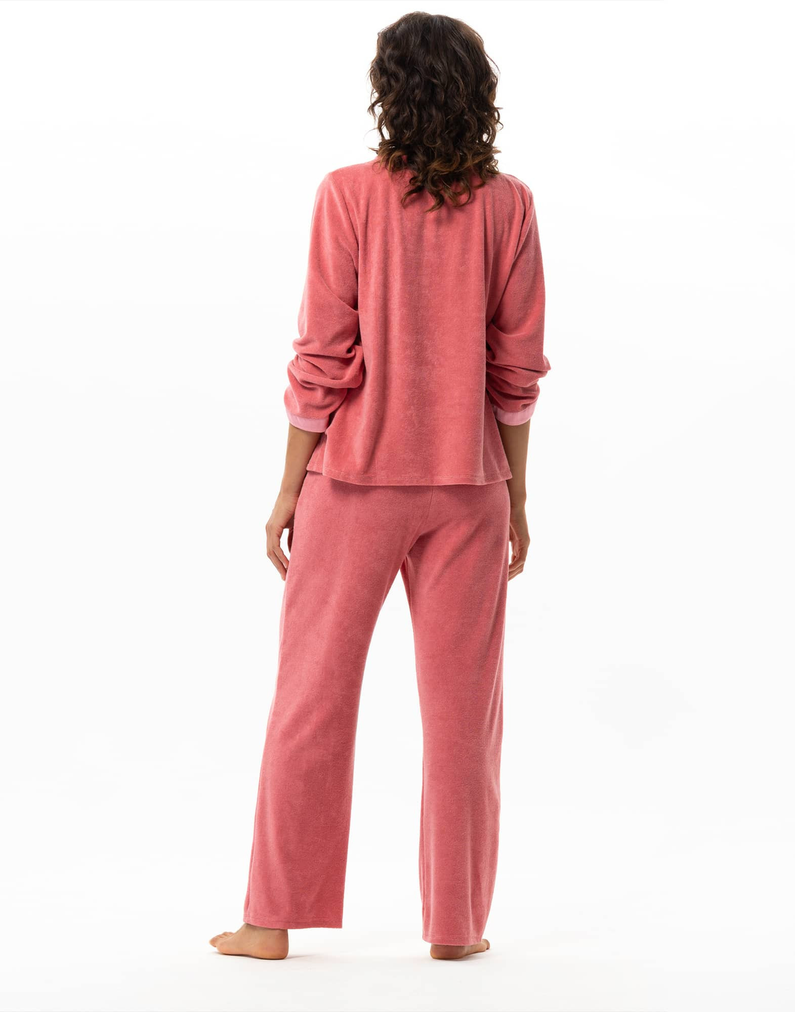 The long-sleeve top of the Gelato homewear set stands out with its satin ribbon at the neckline — a signature detail that structures the look while bringing elegance to its casual spirit. Paired with the elasticated-waist trousers, the silhouette is easy to wear from morning to evening, at home or on getaway.