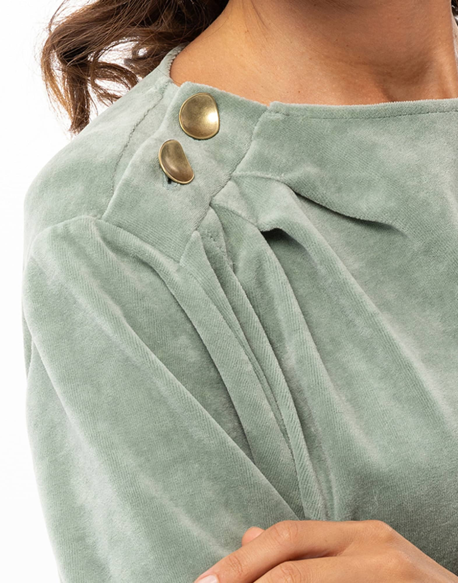 The sweatshirt features shoulder button detailing, like delicate jewelry, that structures the silhouette and creates an elegant, naturally draped effect.