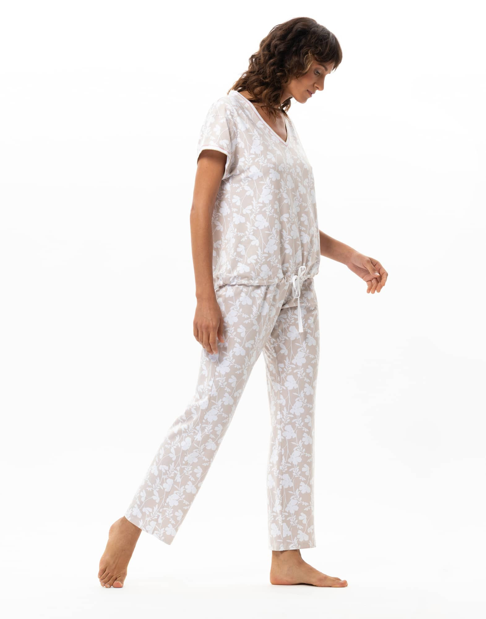 The Siesta pajamas have a relaxed yet feminine look. The slightly blouson-style top, adjustable with a drawstring, shapes the silhouette while offering great freedom of movement.