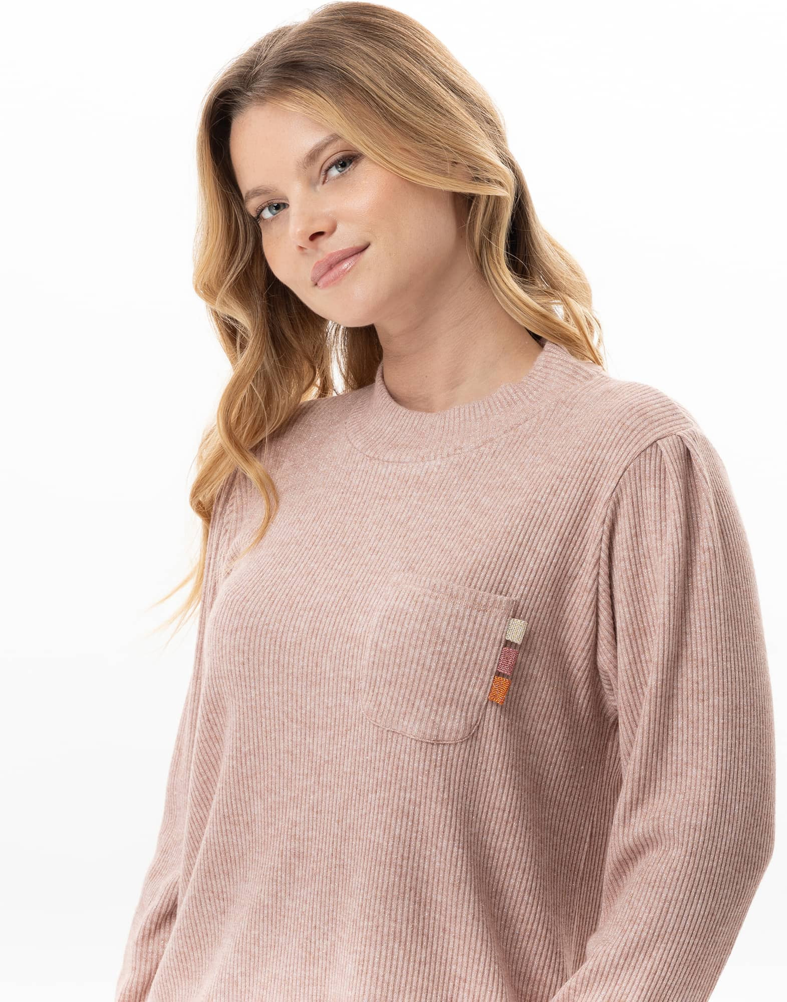 - Sweater with a slightly high round neckline for enveloping comfort.