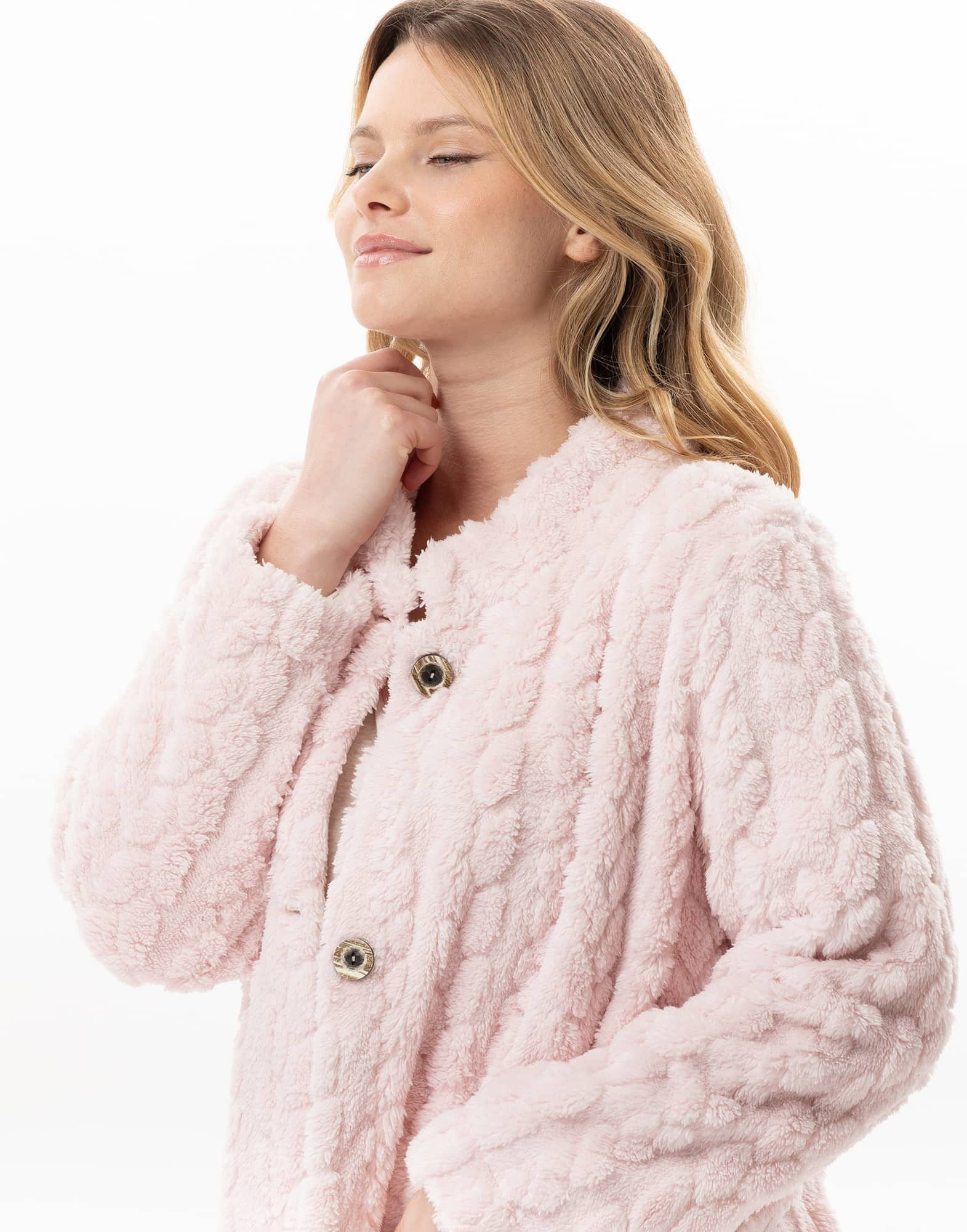With its generous volume, our new fully buttoned jacket accompanies you during all your cocooning moments, from slow breakfasts to snug evenings. Deep navy, radiant rosewood, or luminous ecru — it pairs effortlessly with all your nightwear or loungewear looks.