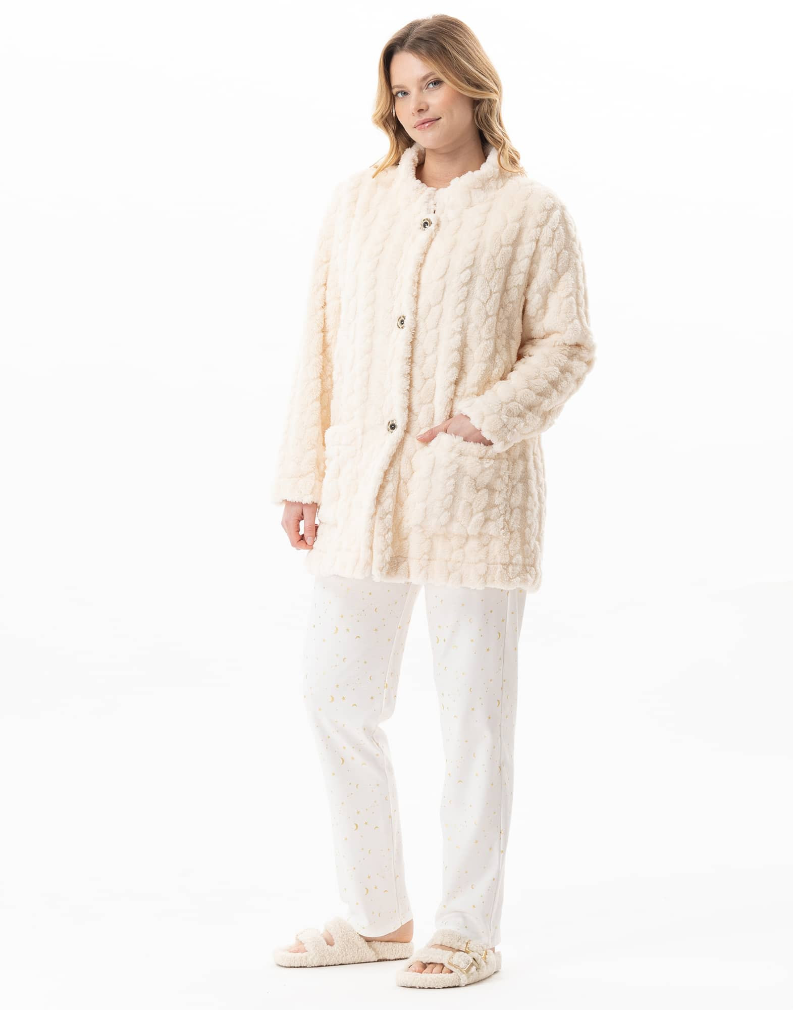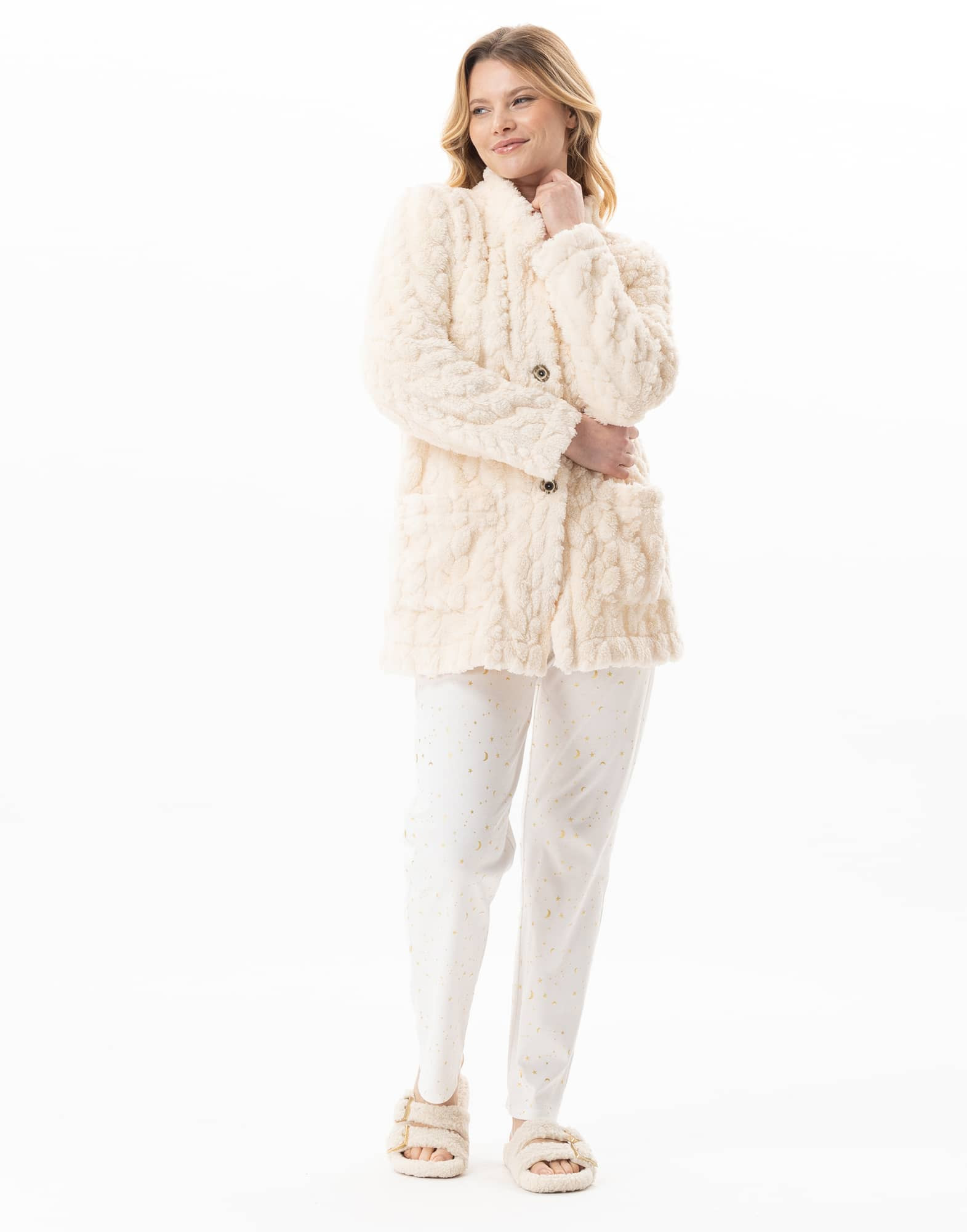 With its generous volume, our new fully buttoned jacket accompanies you during all your cocooning moments, from slow breakfasts to snug evenings. Deep navy, radiant rosewood, or luminous ecru — it pairs effortlessly with all your nightwear or loungewear looks.