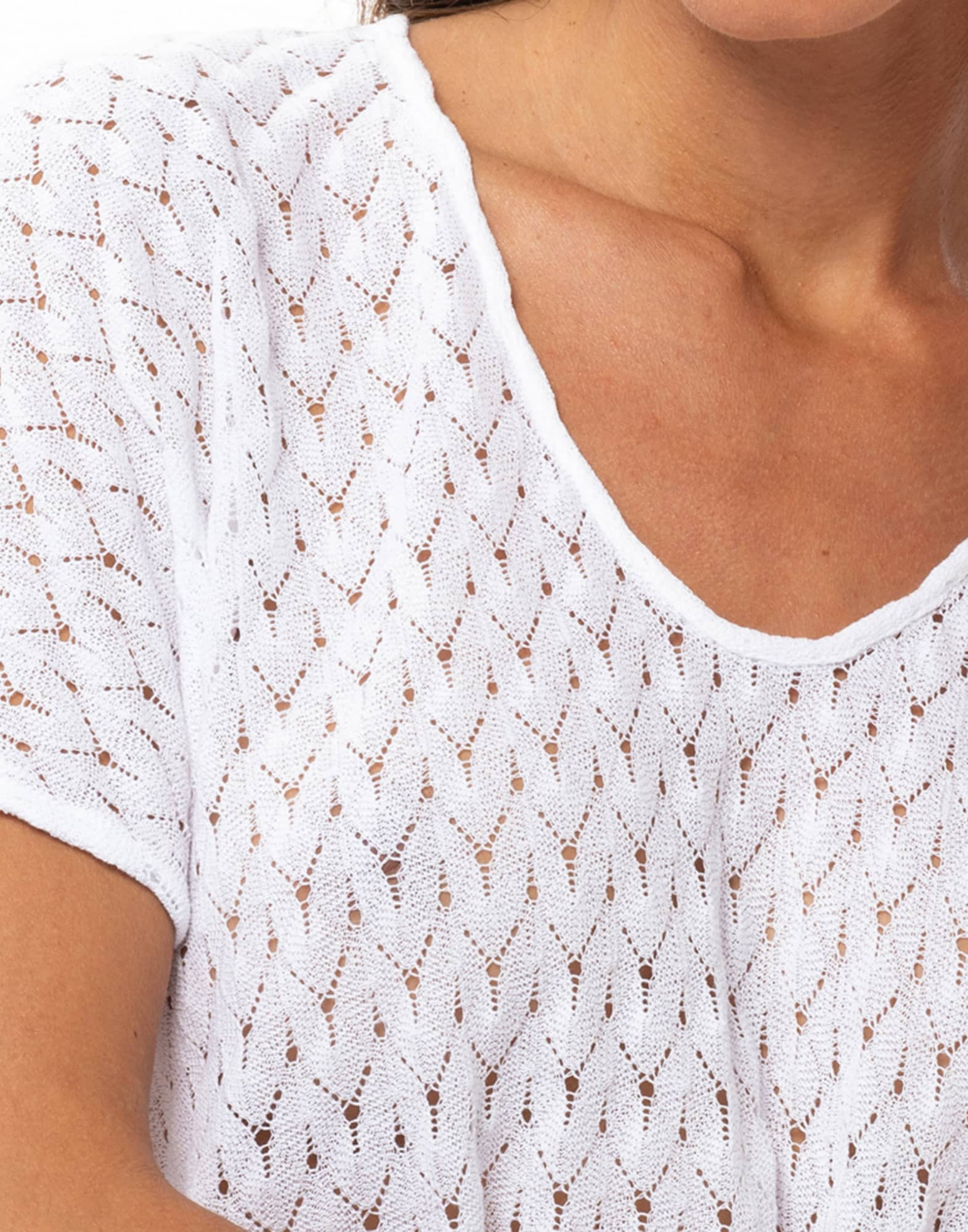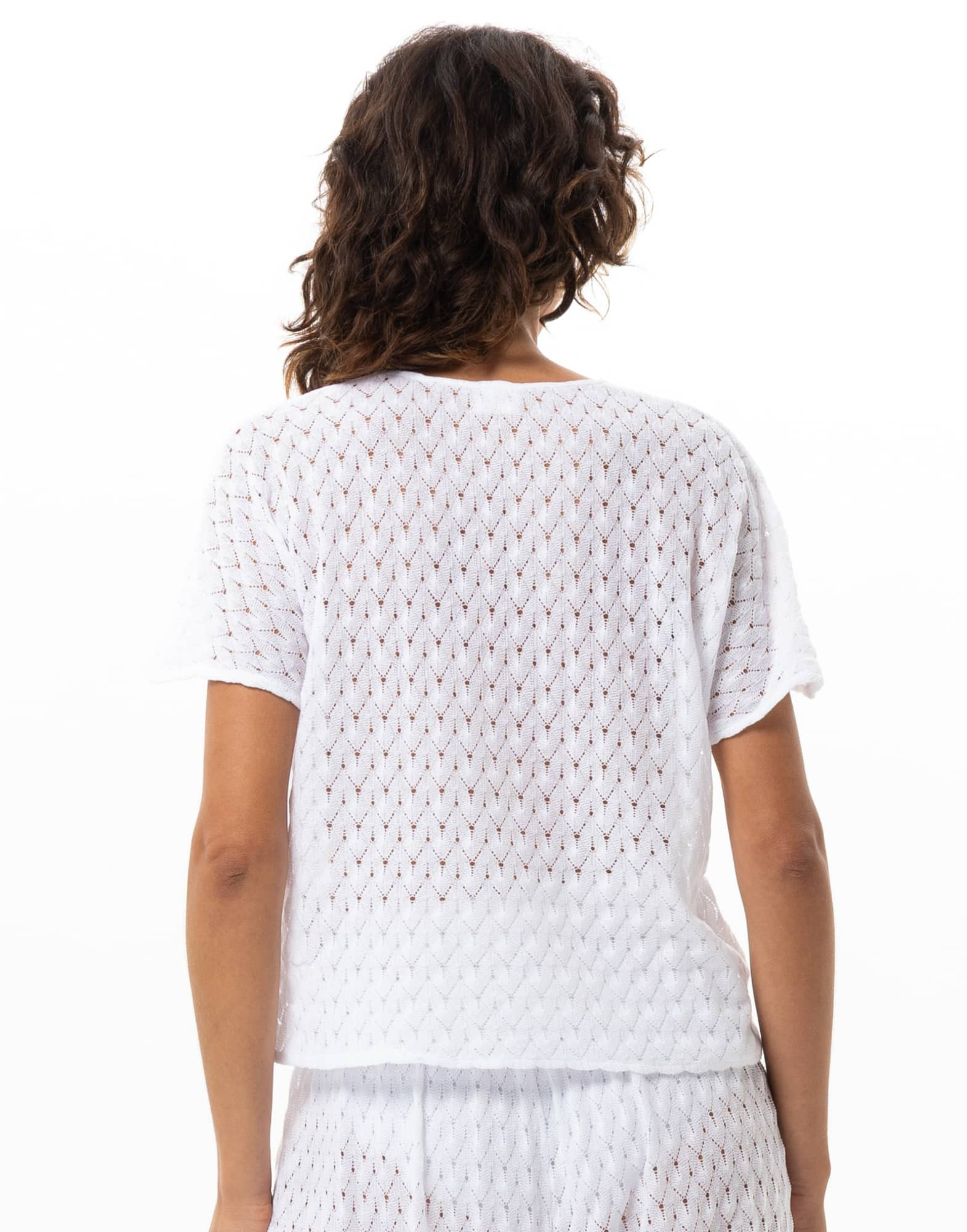 Knitted in Italy, the fabric of the Paillette T-shirt delicately reveals the skin through a graphic openwork knit. Its boxy volume creates a modern silhouette that is easy to wear.