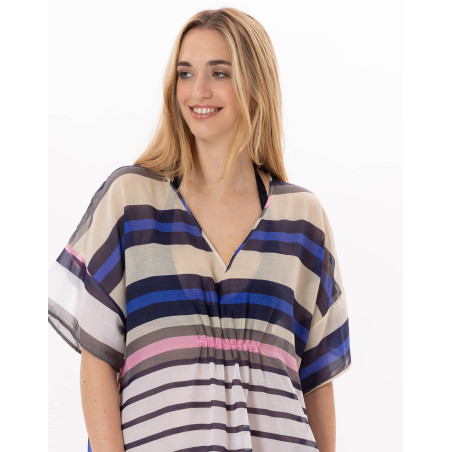 On a soft-touch cotton voile with a crinkle effect, lightly textured and easy to care for, asymmetrical and contrasting stripes bring just the right amount of transparency to the VALLAURIS 940 kaftan, VALLAURIS 941 and 942 dresses and VALLAURIS 980 pants: your lightweight, elegant beach must-haves.