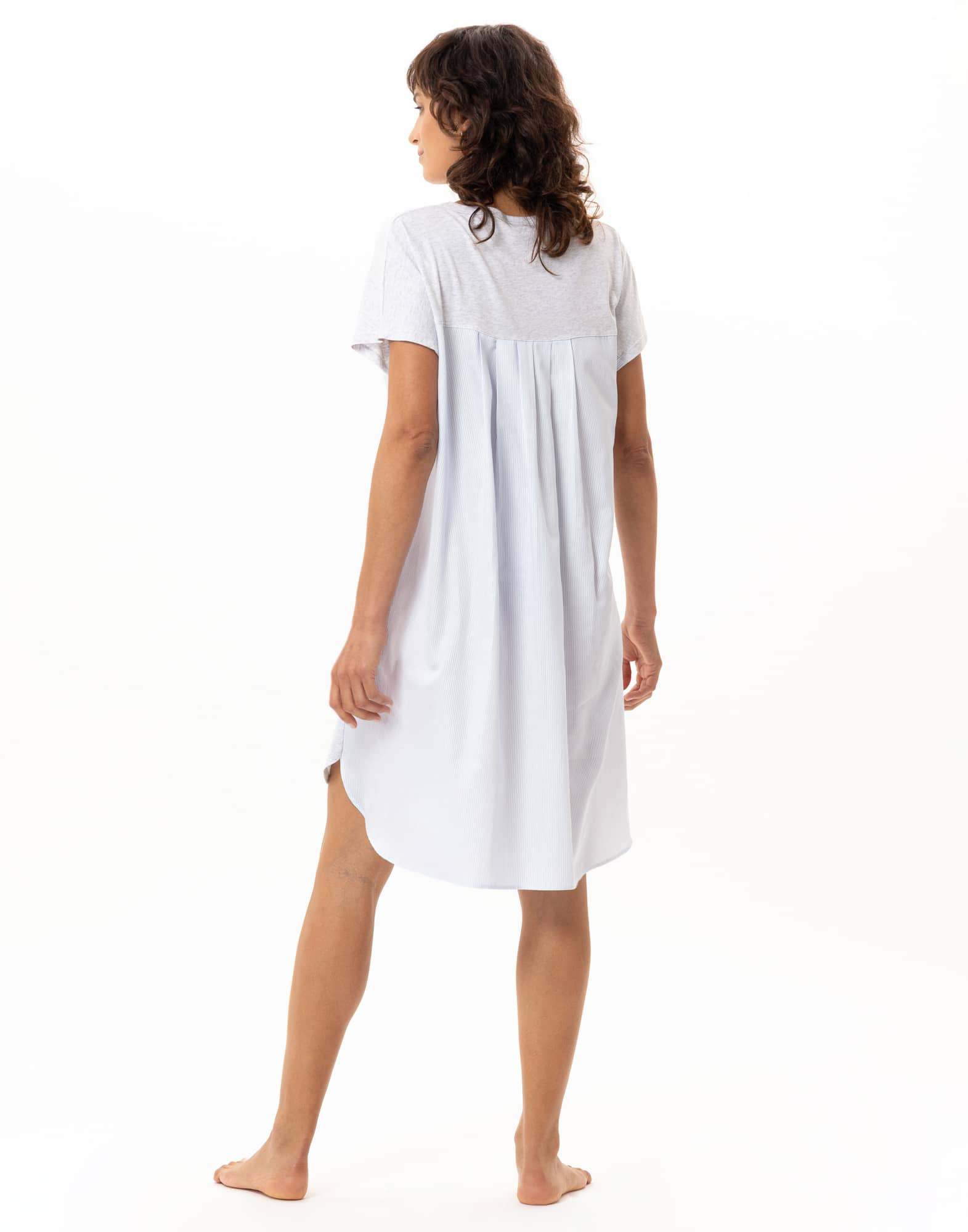 Available in two mix & match combinations, the Amy nightshirt comes in heather grey (cotton-modal) with sky blue stripes (cotton satin), or white jersey paired with beige woven stripes.