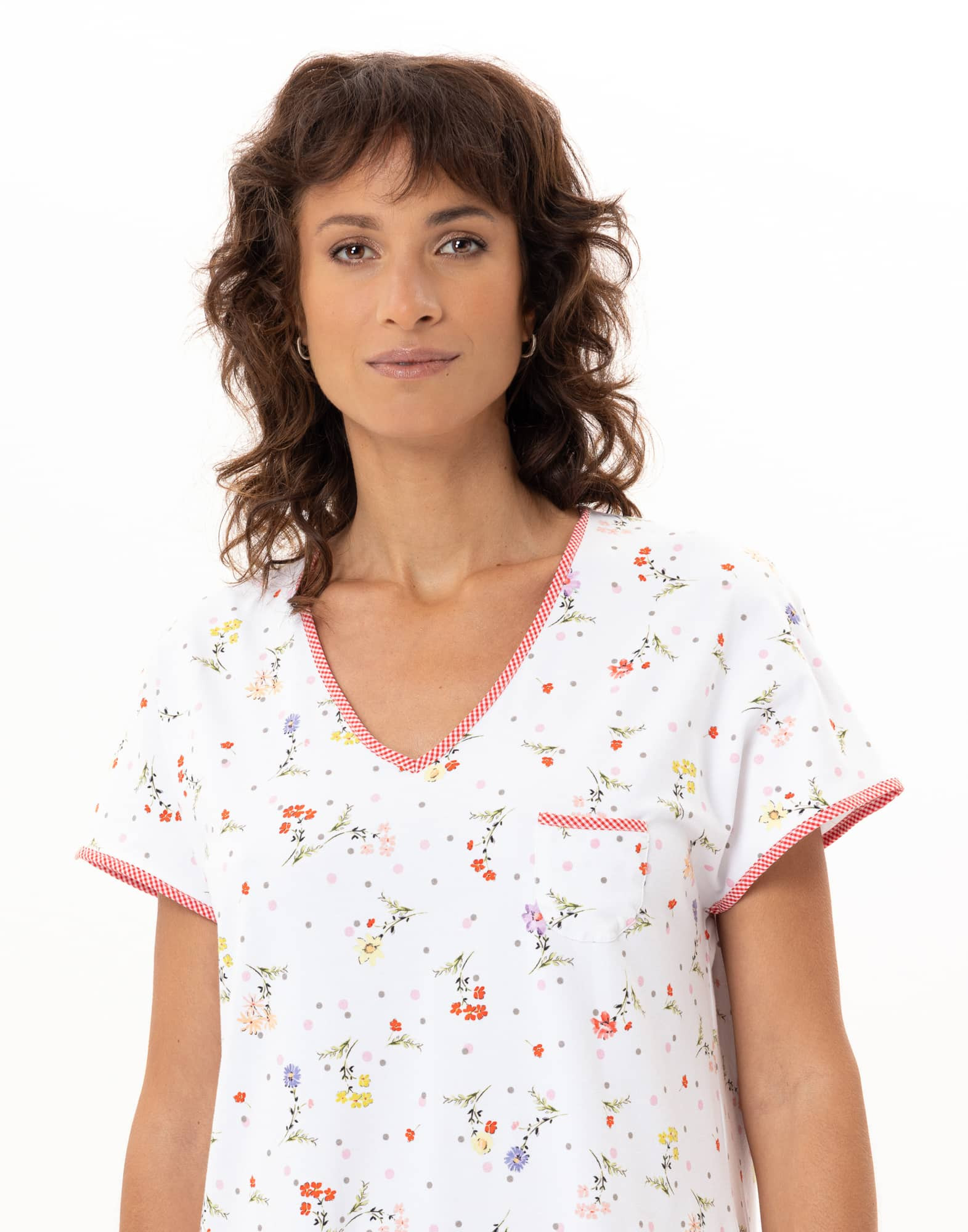 - V-neckline, top of the small decorative chest pocket, sleeve hems and side slits highlighted with a small Vichy check binding