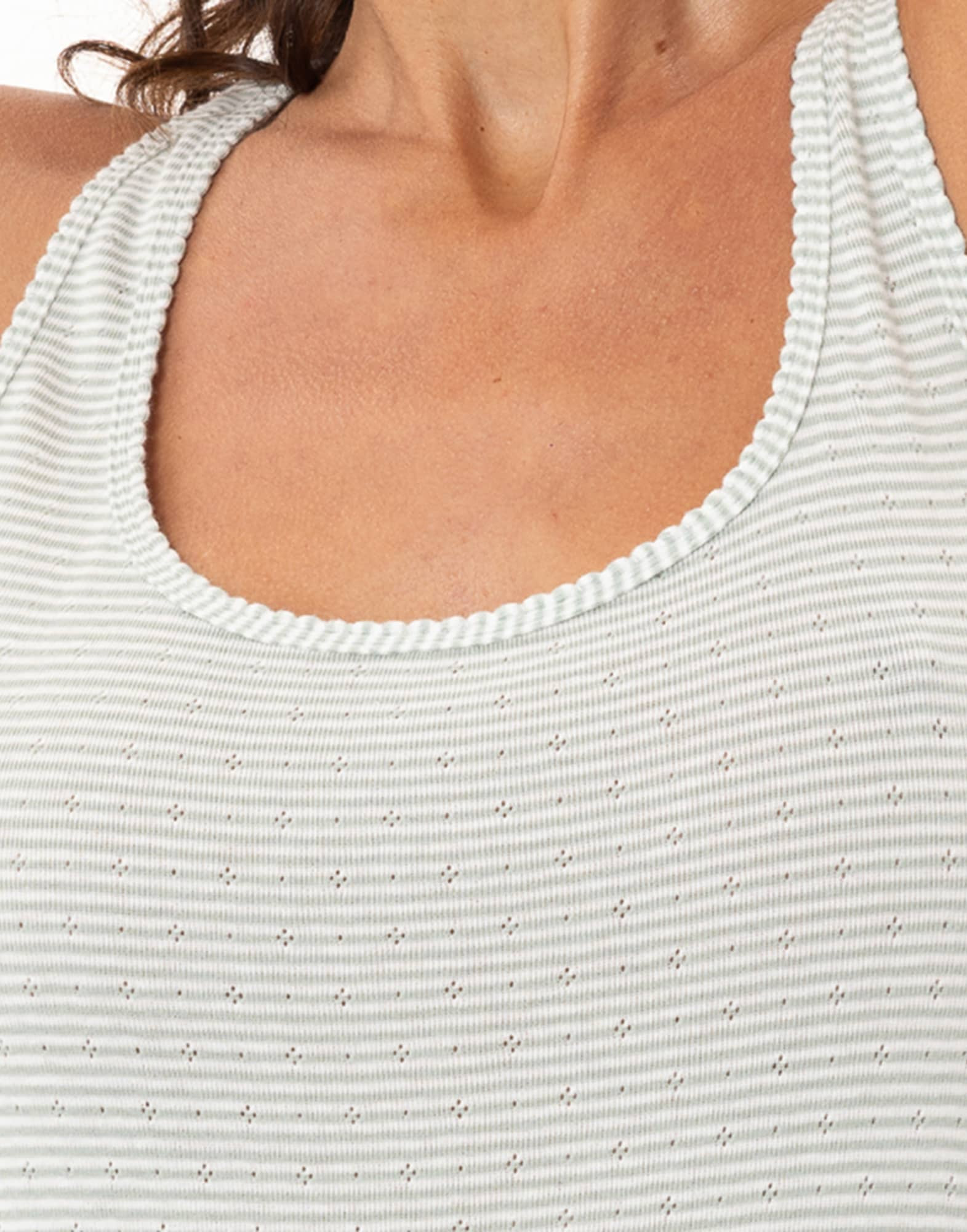 - Round neckline at the front and racerback at the back, both finished with picot-edge trim.