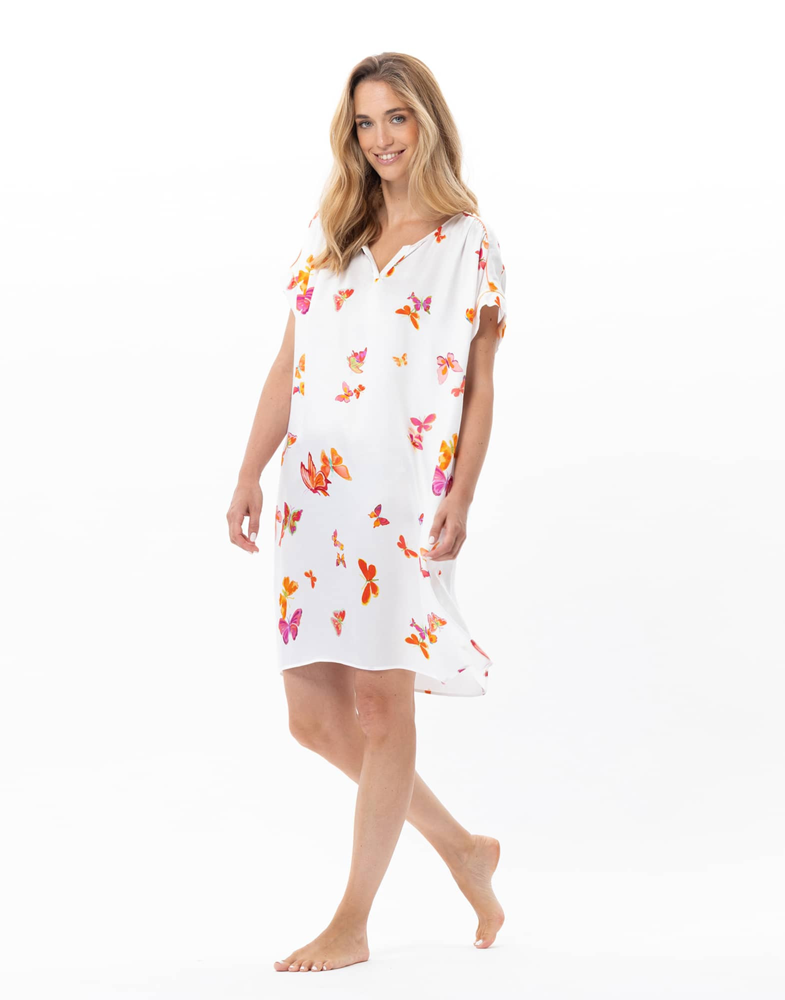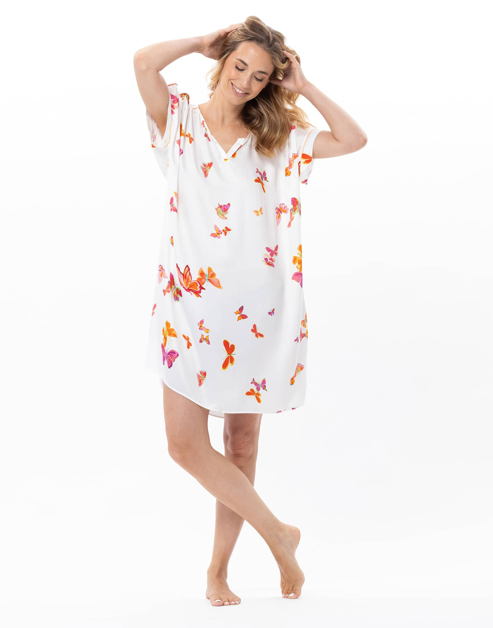 The multicolour butterflies—one of our exclusive seasonal prints—bring a fresh, vibrant touch to this highly feminine nightwear piece.