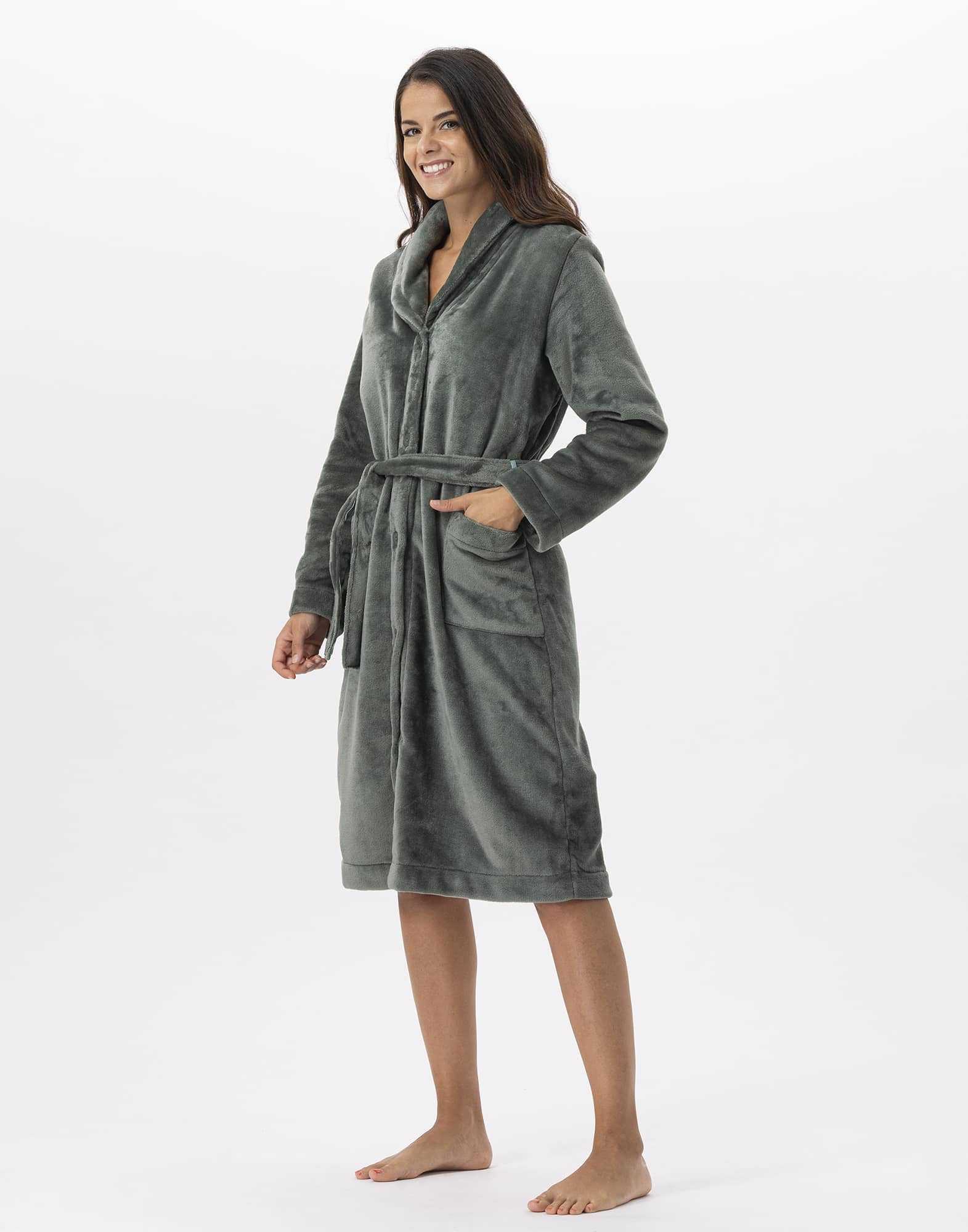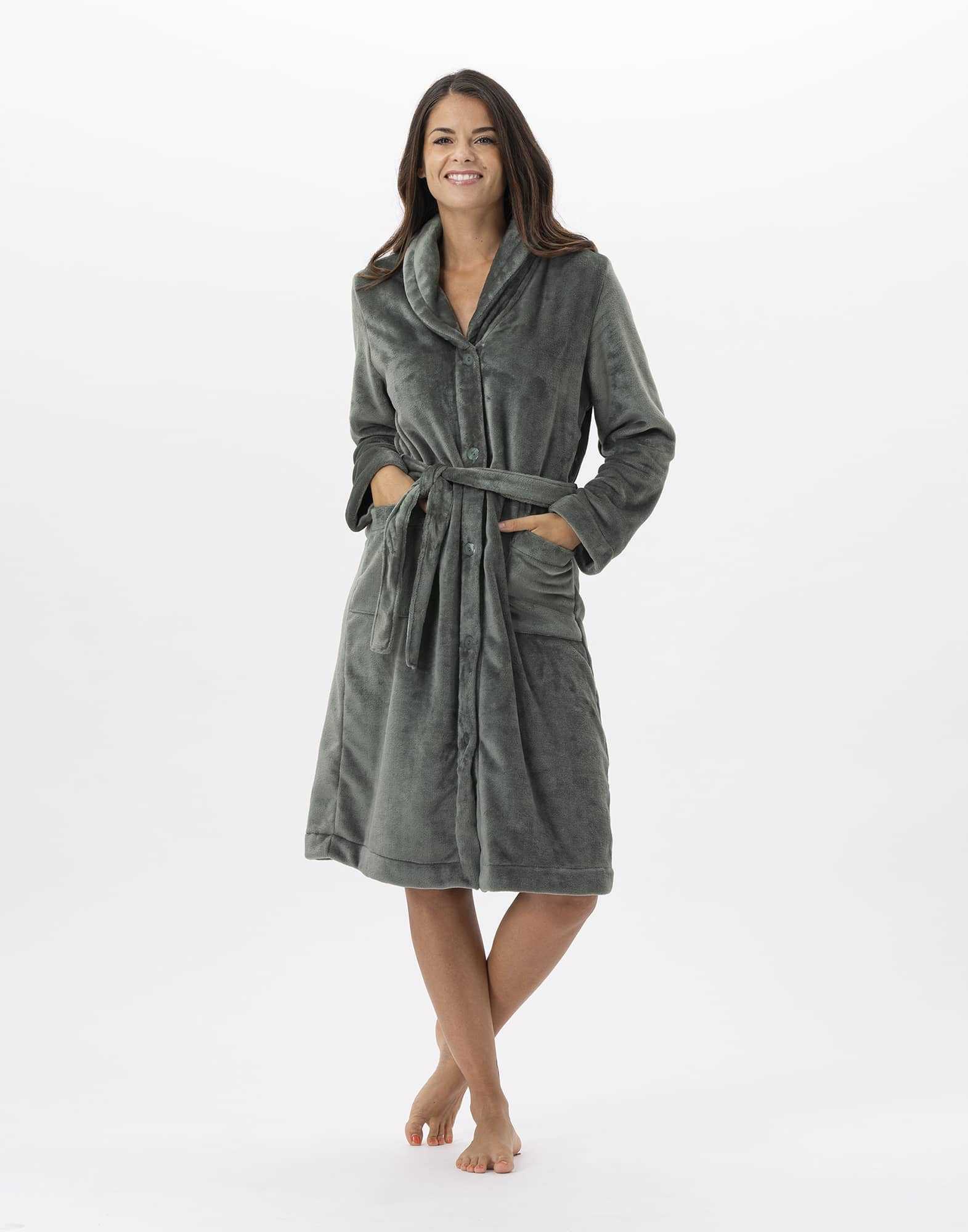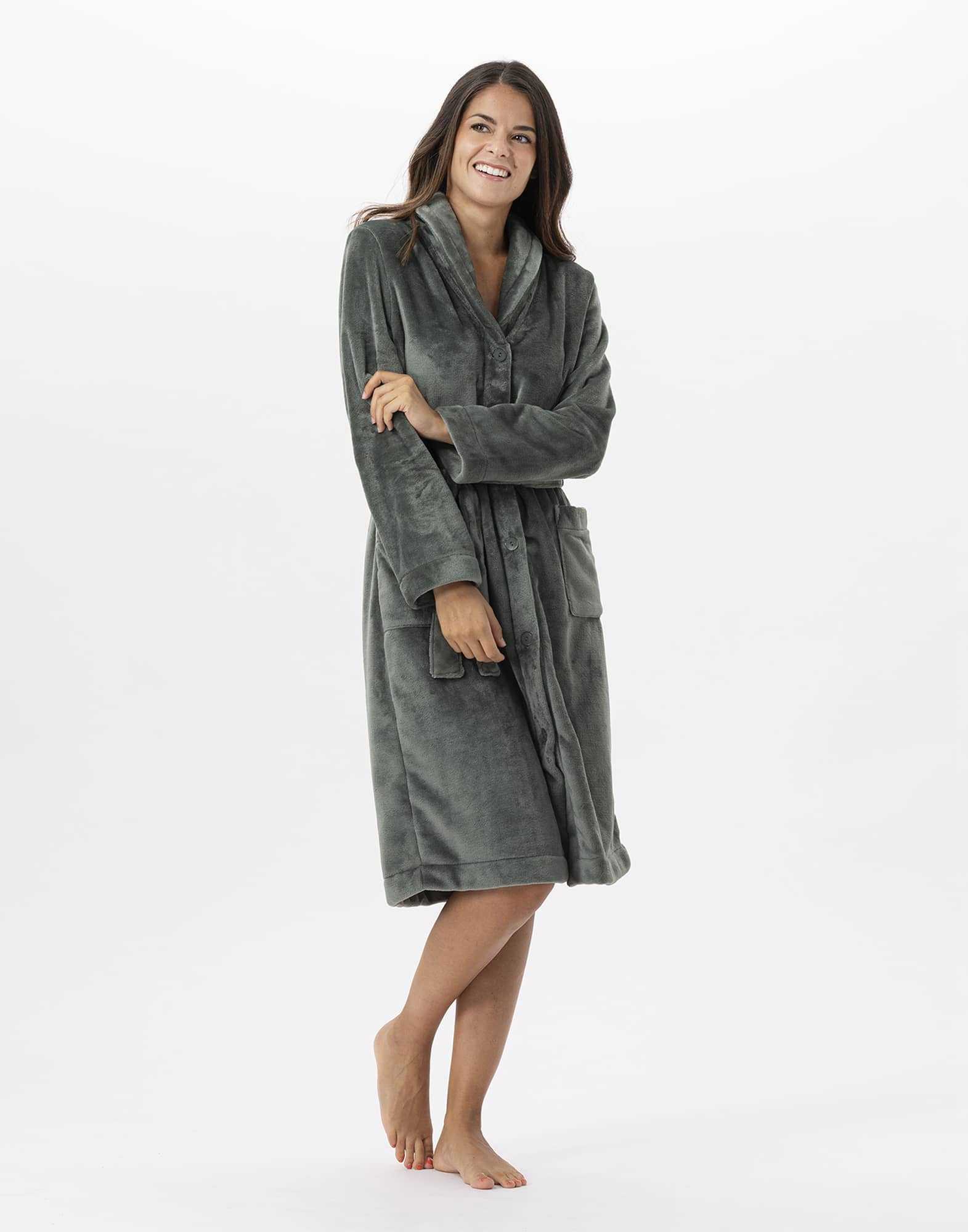 Plush flannel button-down dressing gown ESSENTIEL moss green