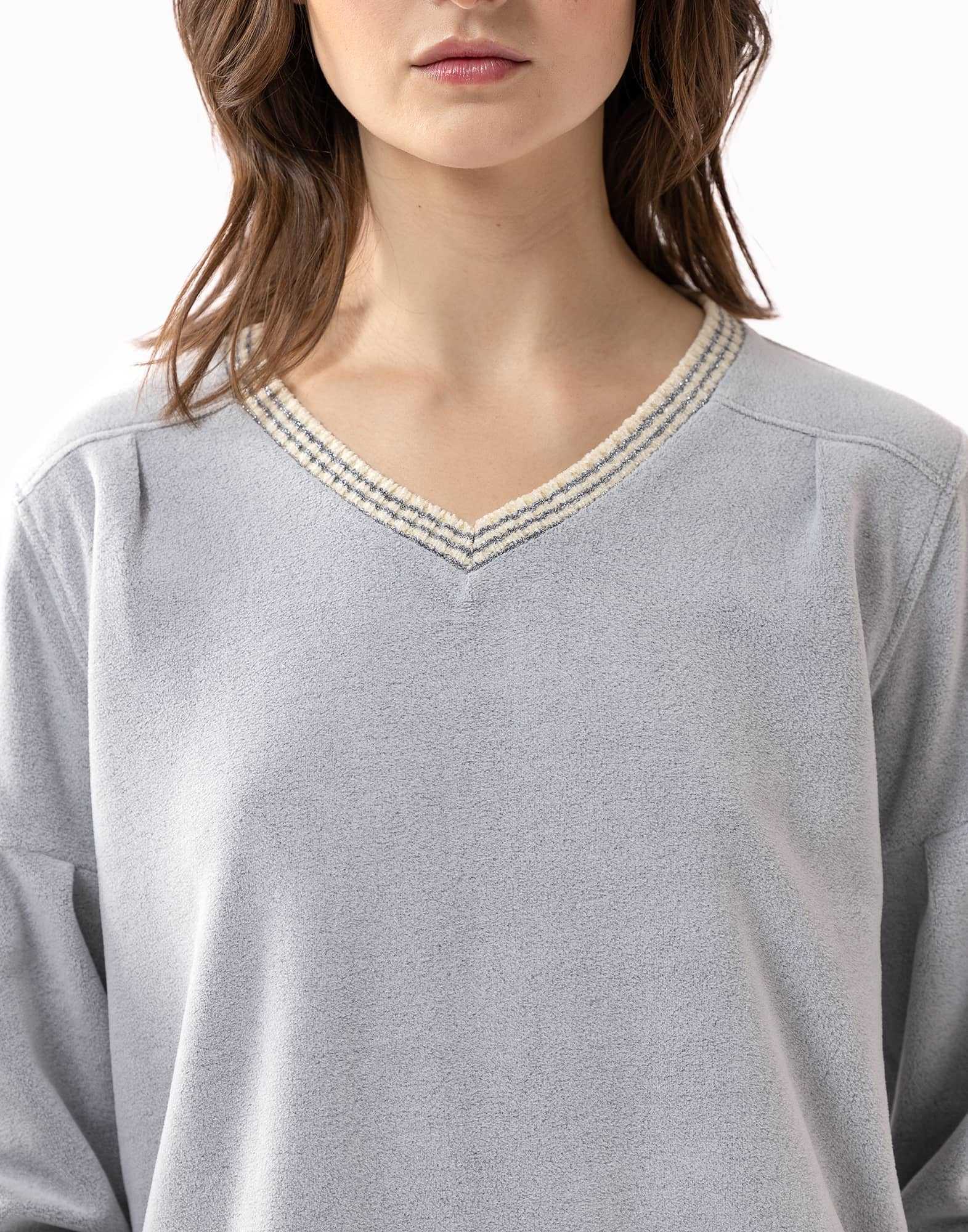 - Encolure V souligné par un bord côte en chenille rayure lurex doré