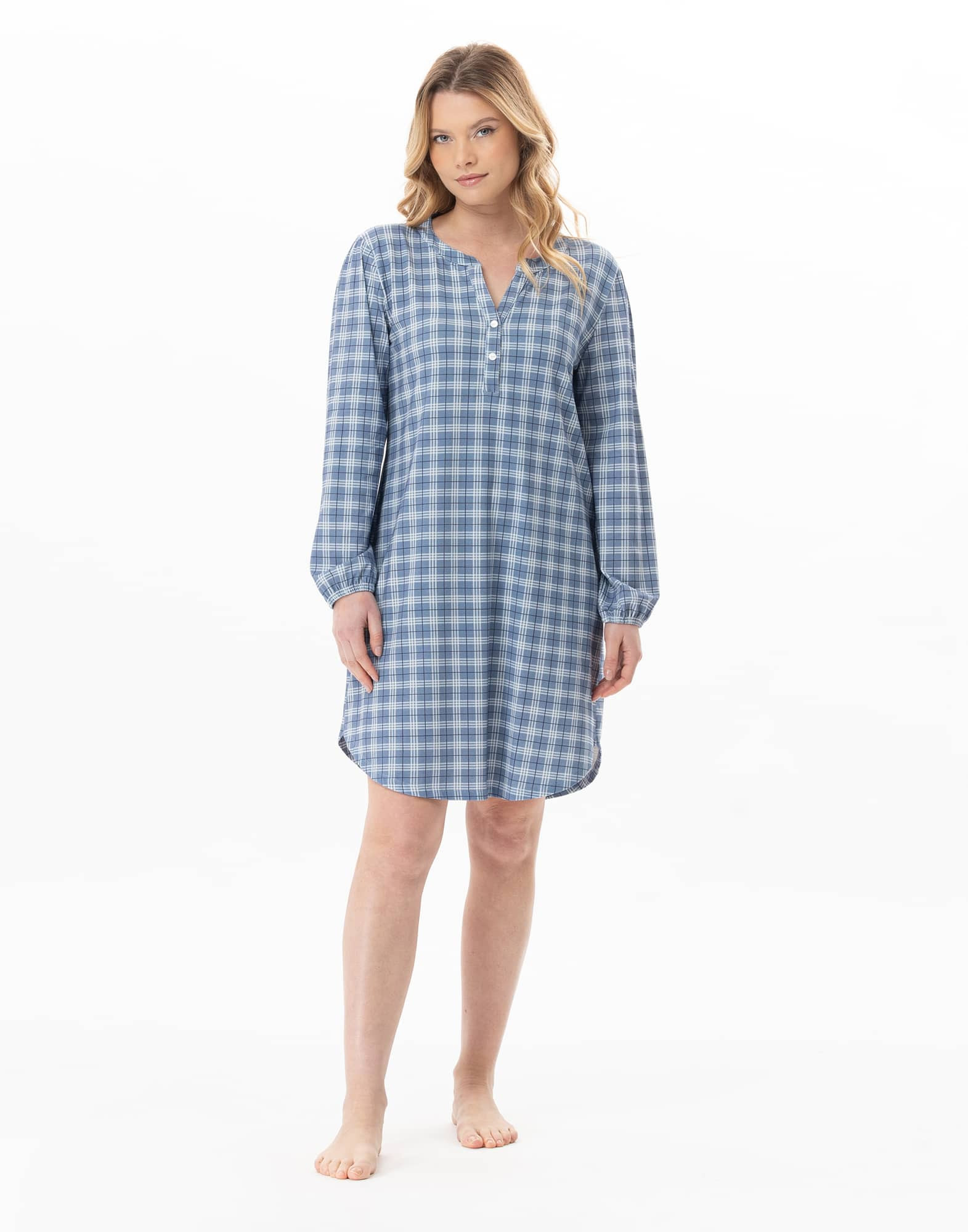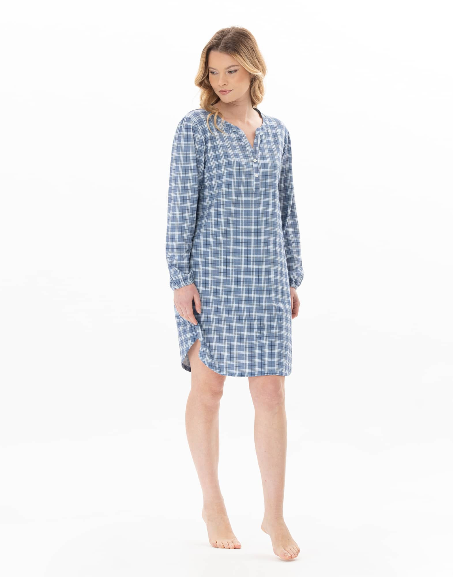 Son imprimé à carreaux bleus joue la carte du cool intemporel, clin d’œil aux chemises qu’on aime emprunter, version cocooning.