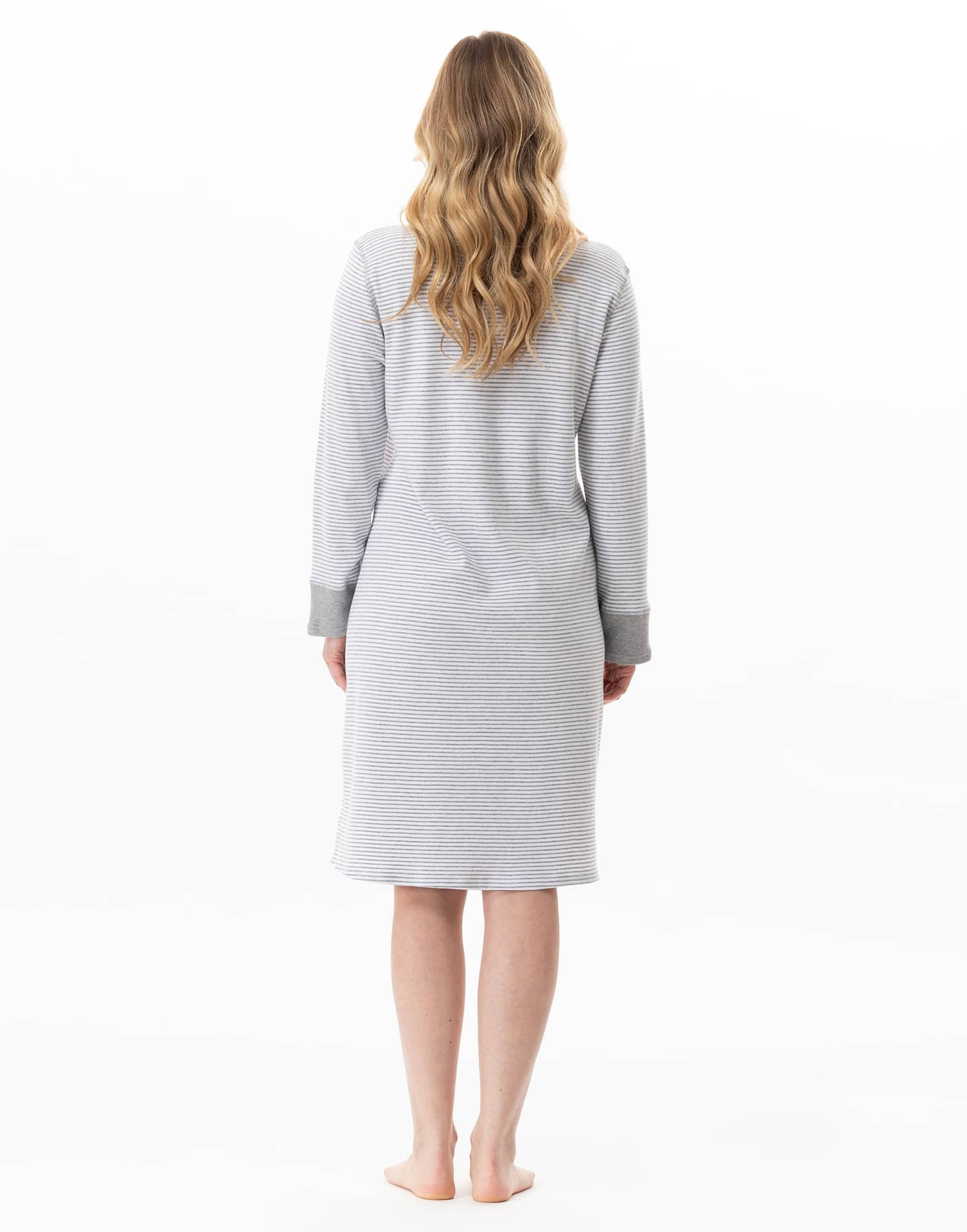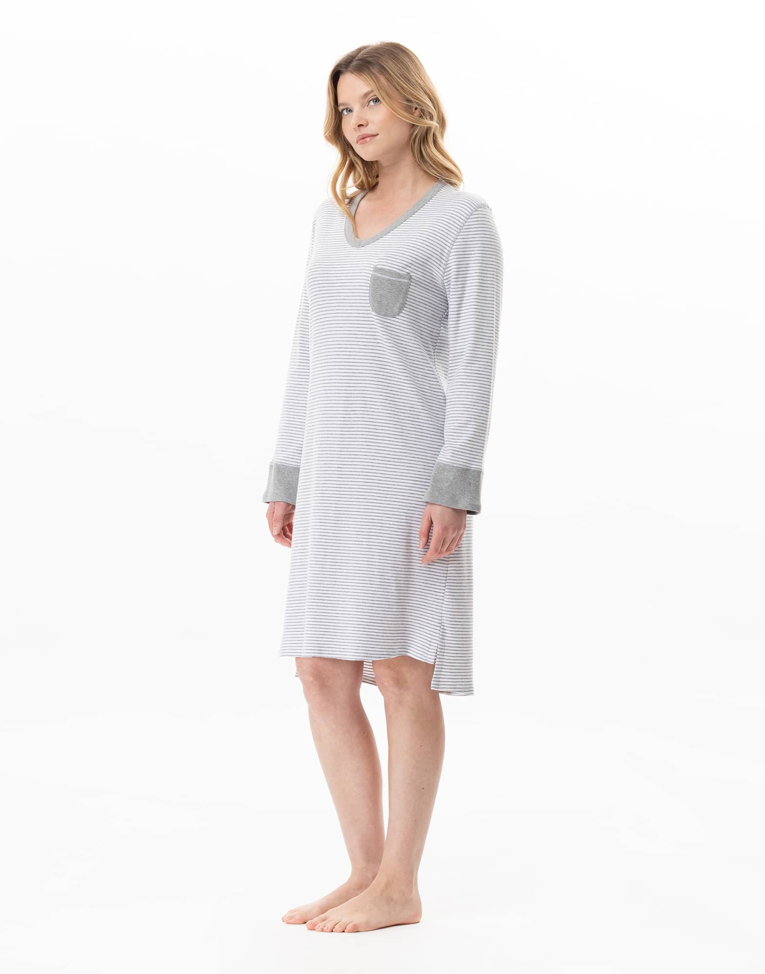 - Finitions contrastées gris chiné : bordage à l’encolure V arrondie, petite poche poitrine et larges bracelets aux manches longues.