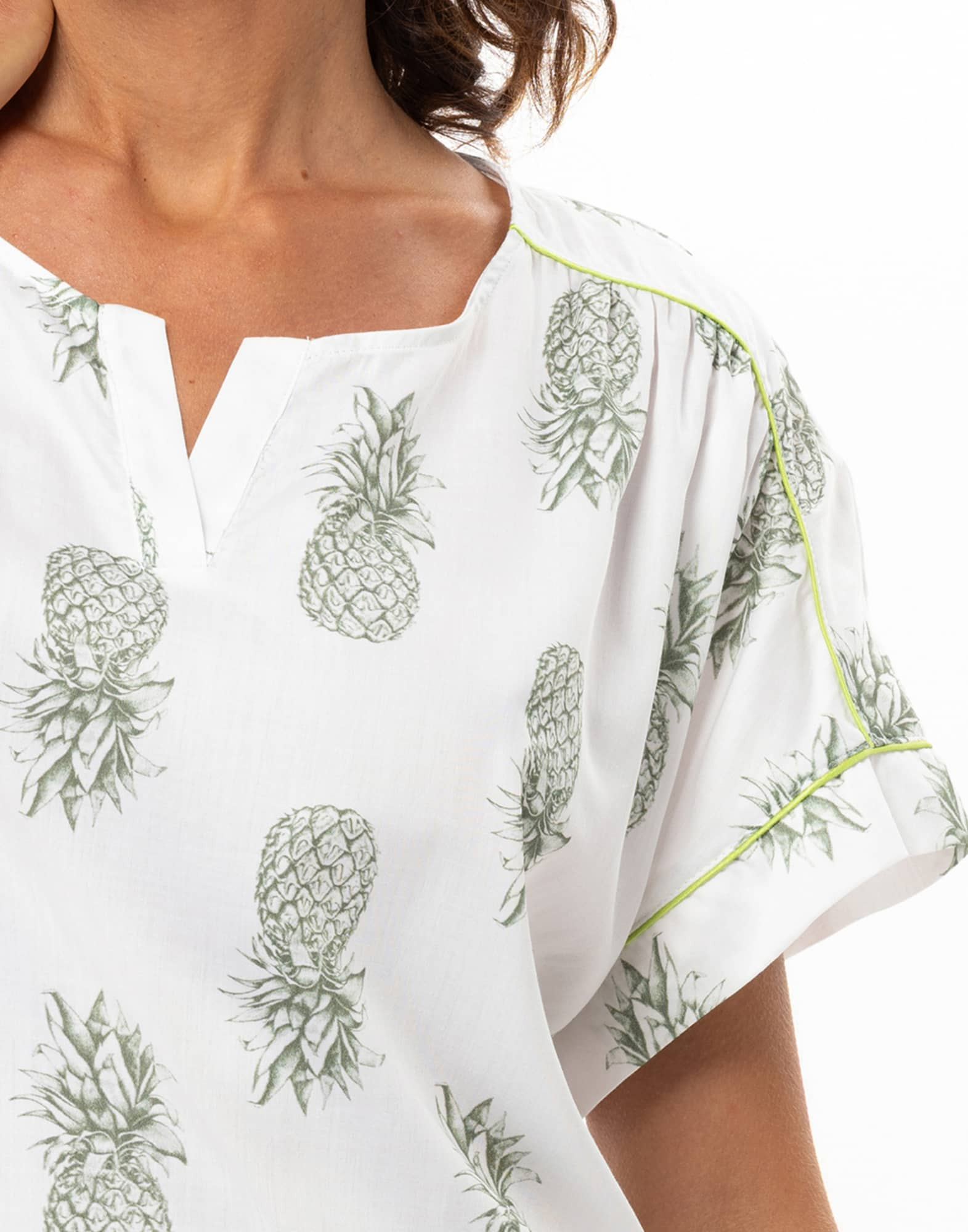 Avec son imprimé ananas exclusif, la chemise de nuit Acapulco s’inscrit dans l’esprit de notre Jardin Exotique en apportant une touche solaire à votre vestiaire nightwear. Son satin de coton offre le combo parfait entre douceur, légèreté et tenue.