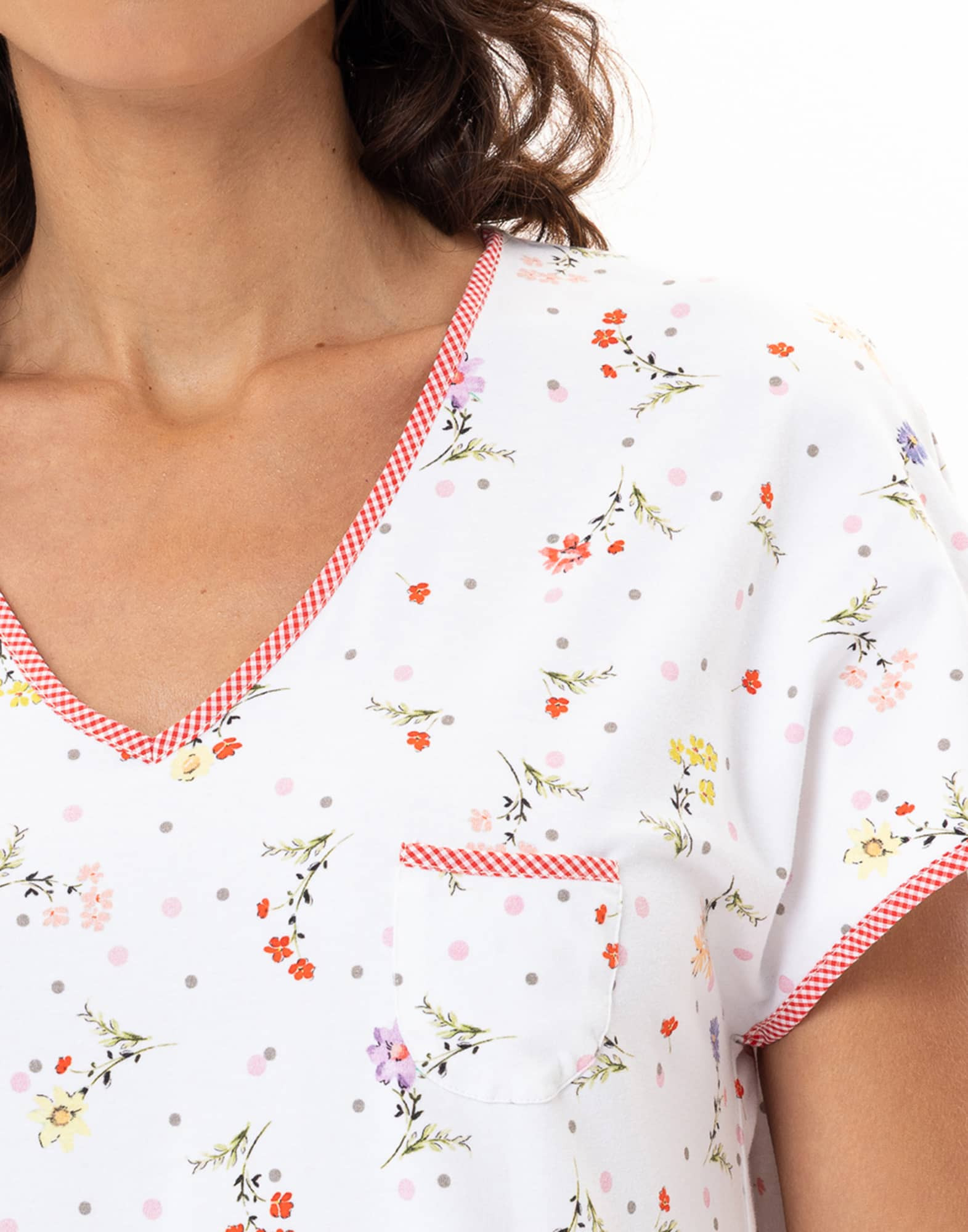 - Encolure V, haut de petite poche poitrine décorative, bas de manches et fentes côtés soulignés par un petit biais en carreaux Vichy