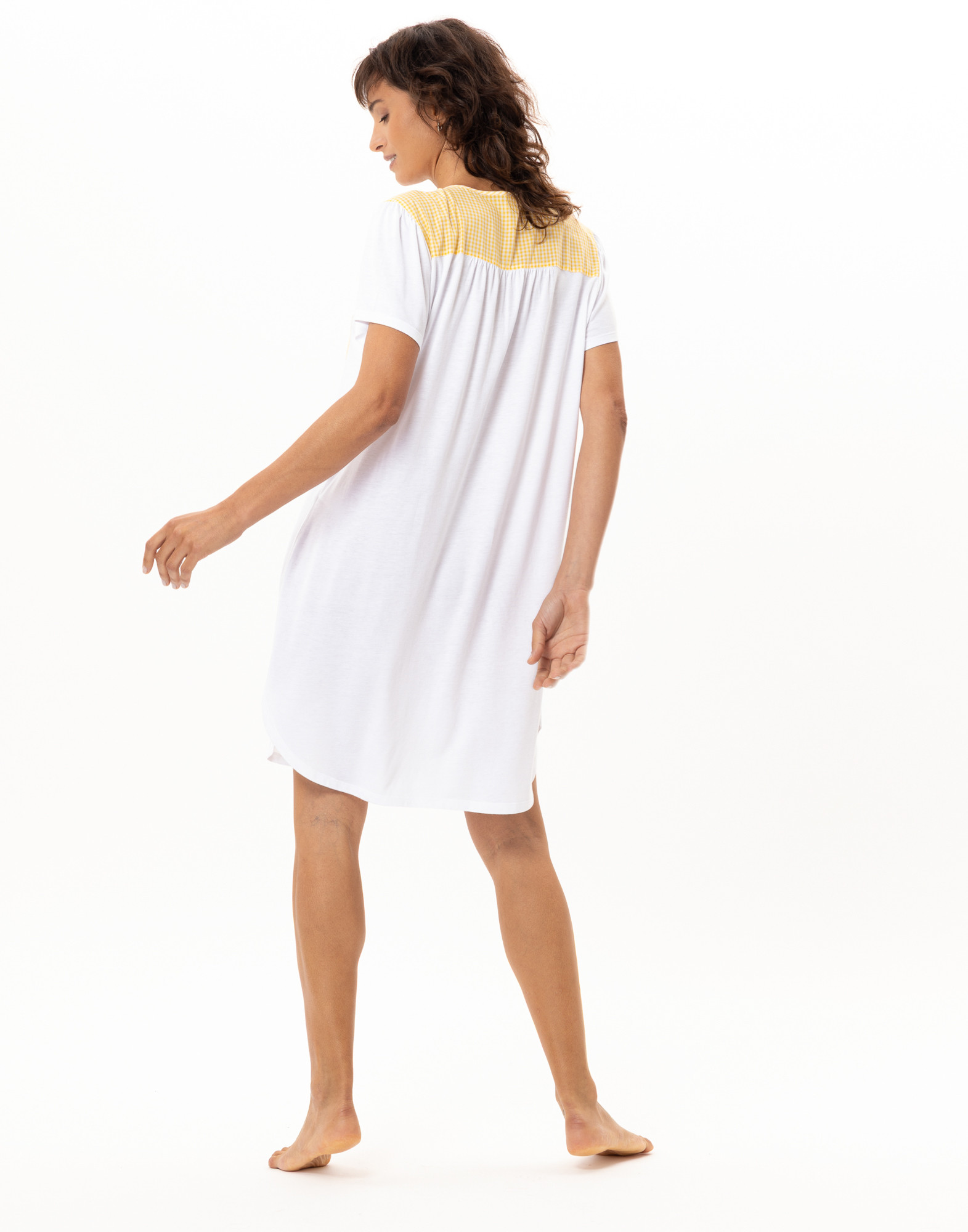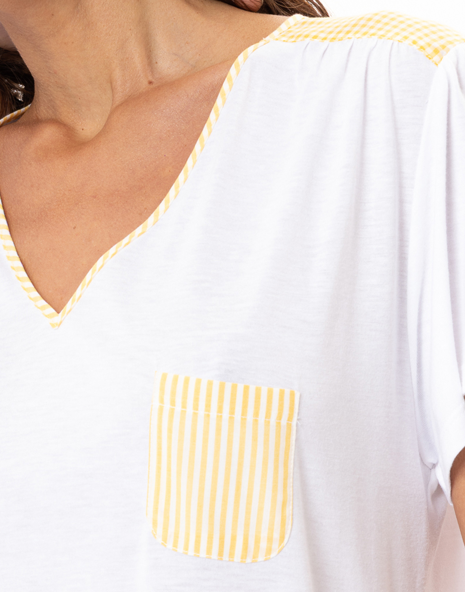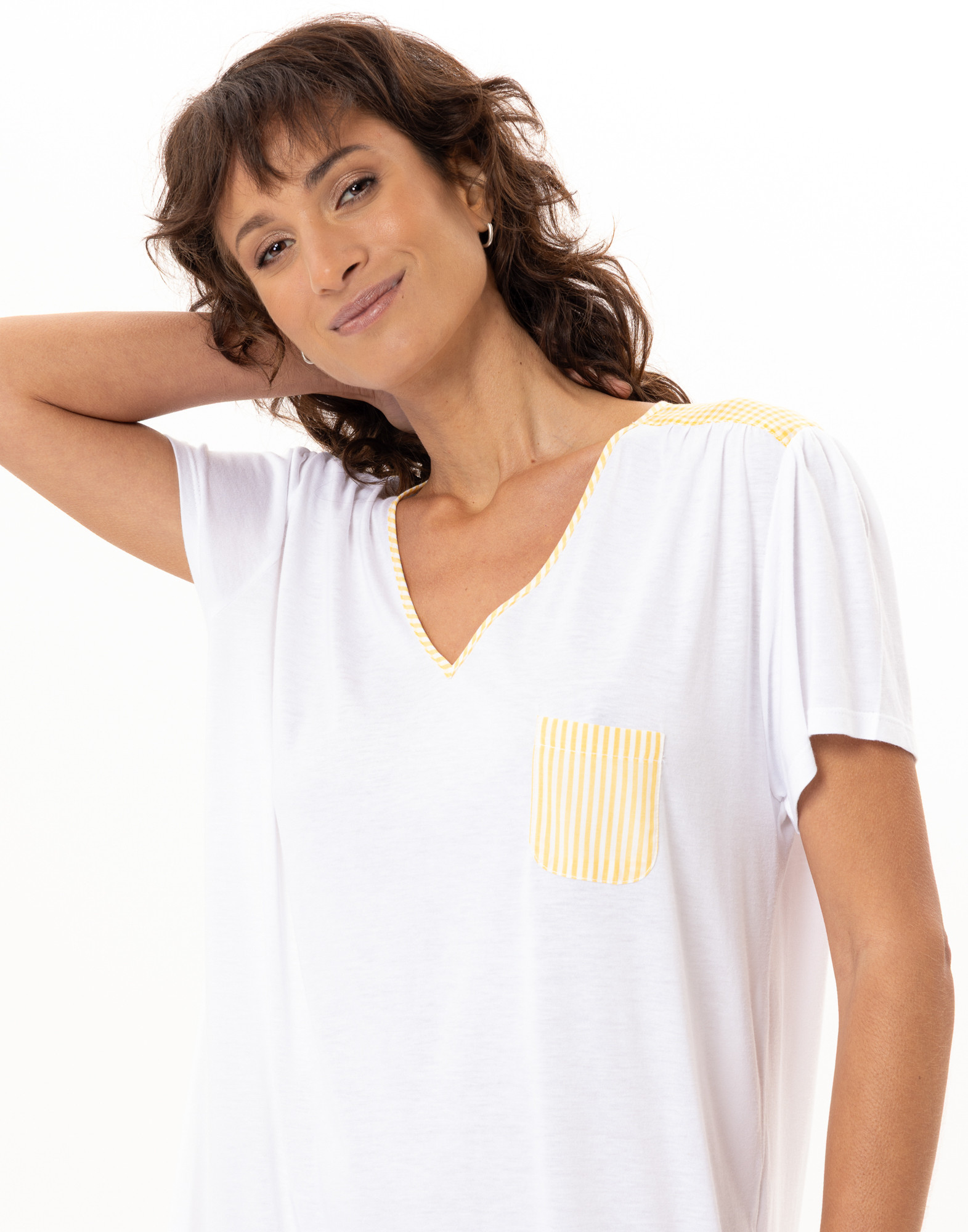 Confectionnée dans un jersey doux et fluide, votre indispensable de nuit s’habille d’empiècements et détails mix & match carreaux vichy et fines rayures.