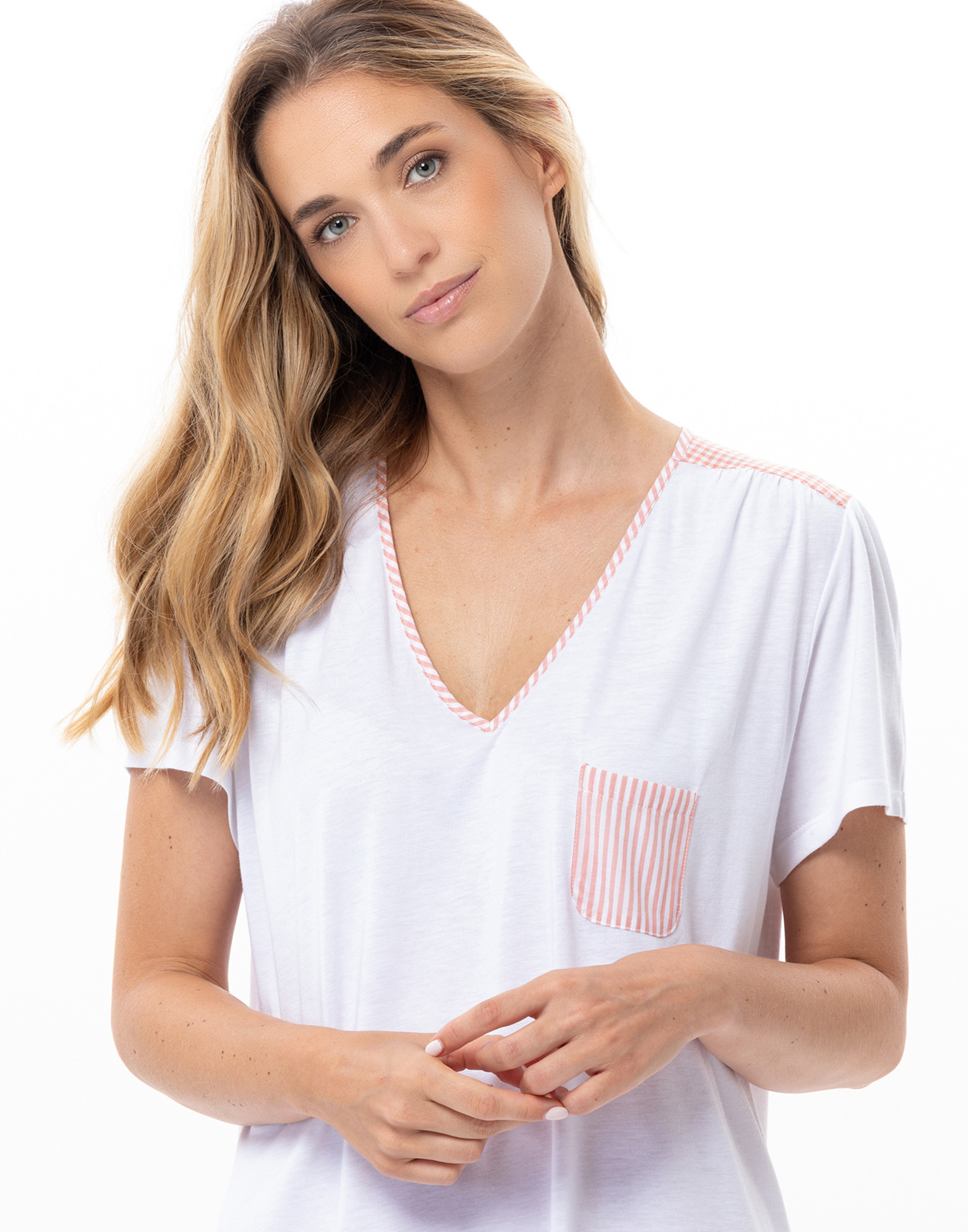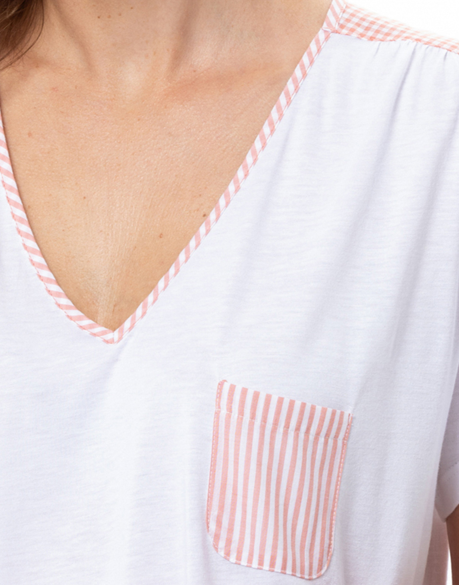 Confectionnée dans un jersey doux et fluide, votre indispensable de nuit s’habille d’empiècements et détails mix & match carreaux vichy et fines rayures.