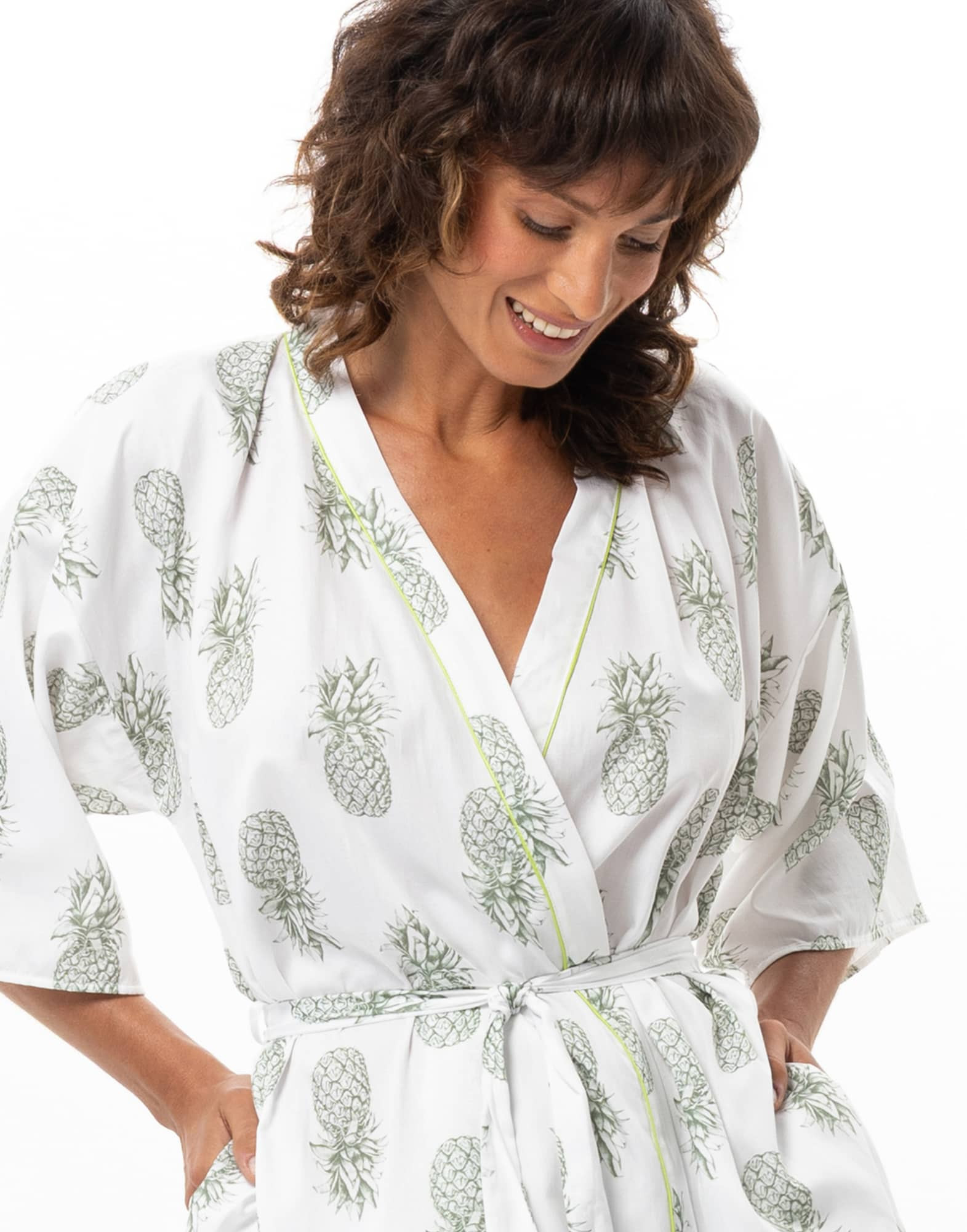 Avec son imprimé ananas exclusif, le kimono Acapulco prolonge l’esprit du Jardin Exotique et insuffle une touche solaire à votre vestiaire homewear. Son volume ample, ceinturé à la taille, dessine une silhouette féminine, à ajuster selon vos envies.