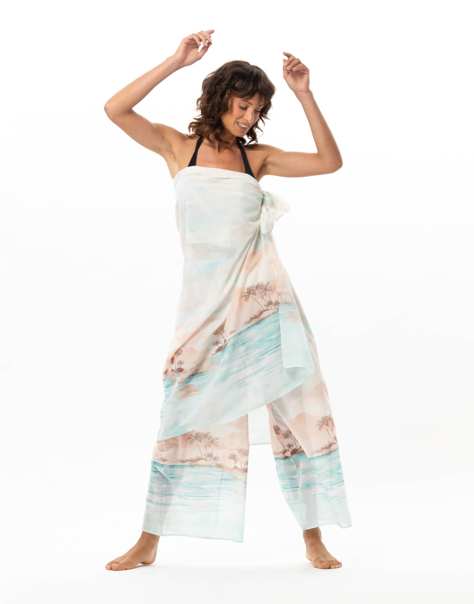 Son voile de coton confectionné en France dévoile des palmiers en bord de mer, dans un paysage teinté de rose au moment du coucher du soleil, évoquant ces fins de journées d’été entre dernière baignade et douceur du soir.