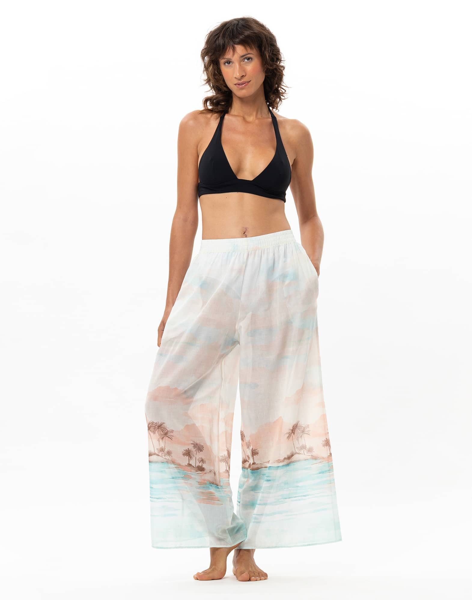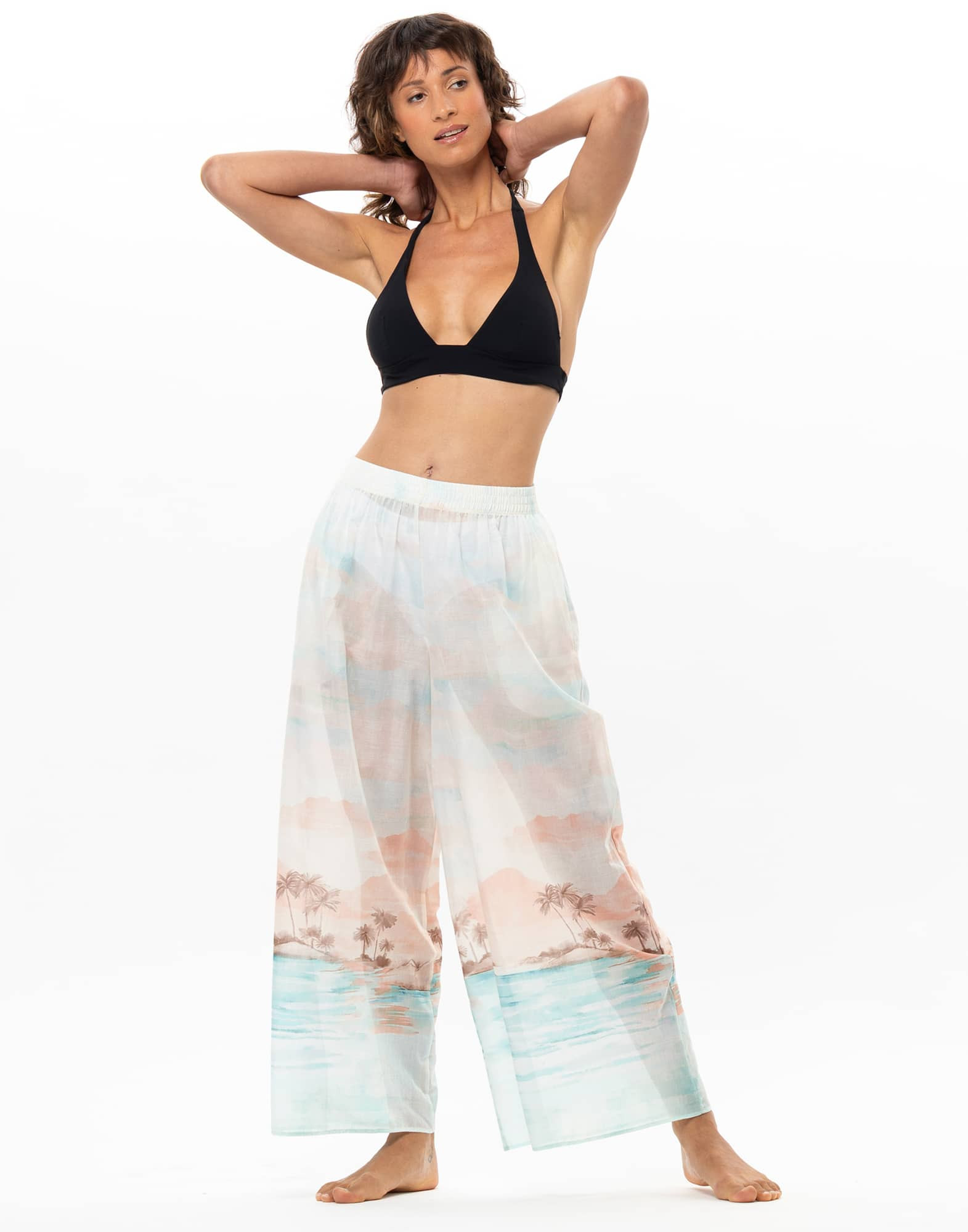 Sunset rejoint Le Jardin Aquatique, notre capsule beachwear qui compose un vestiaire solaire et empreint de liberté. Léger et fluide, le pantalon Sunset se porte facilement tout l’été.