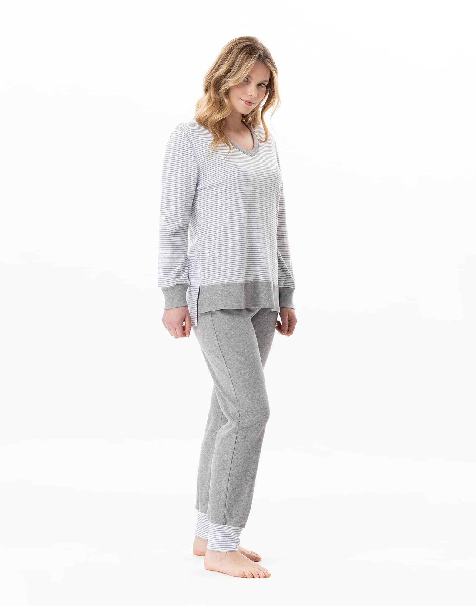 - Finitions en gris chiné : bas du top, bord à l’encolure V arrondie, larges bracelets aux manches longues et en bas de jambes.