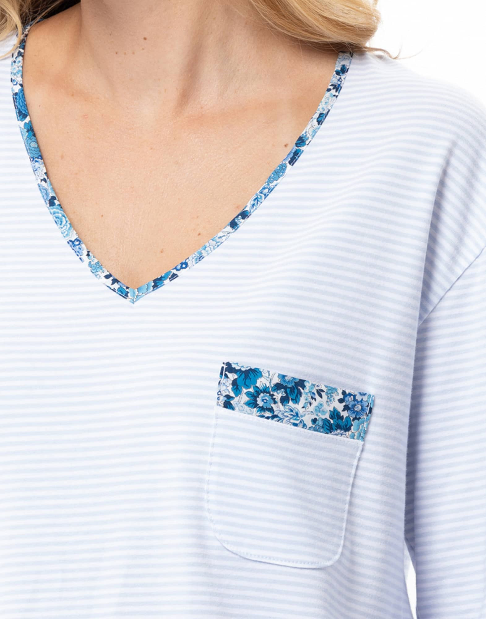 - Encolure en V arrondi, soulignée par un délicat biais en Liberty