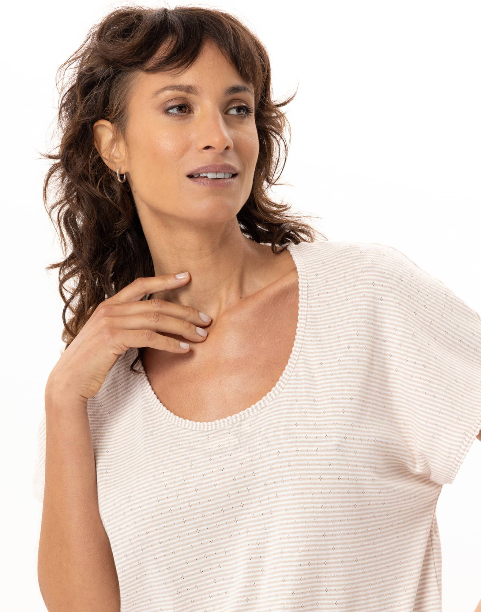 - Top à encolure ronde et manches courtes soulignées d’une finition point cocotte.