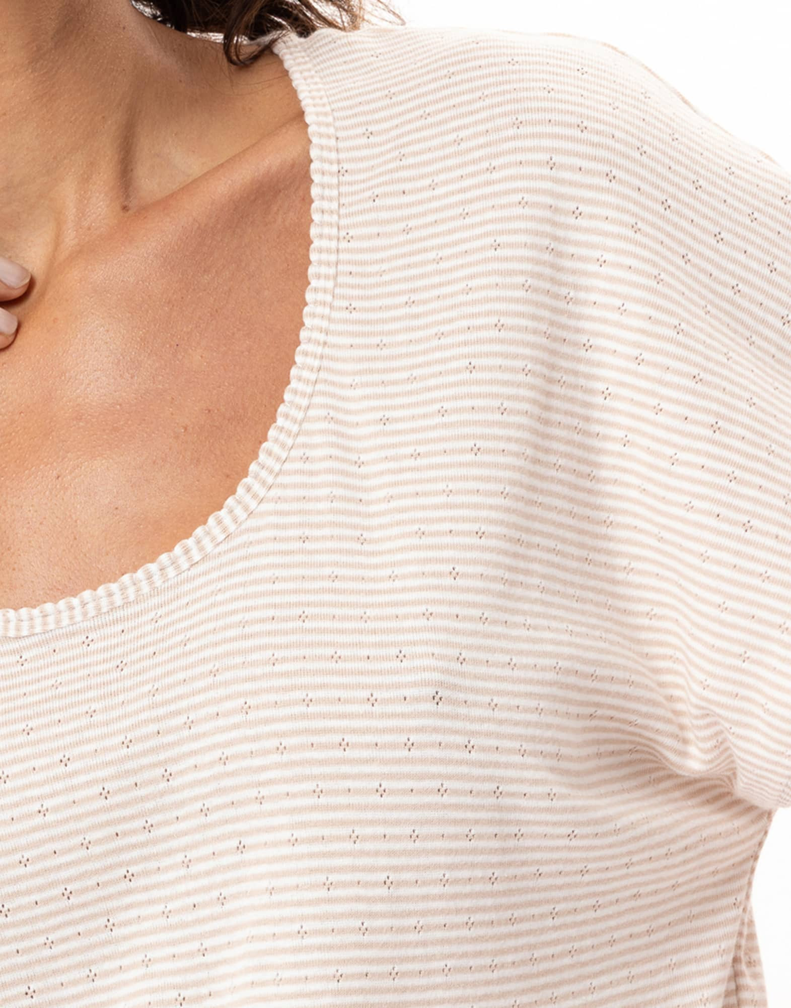 Pensé comme un véritable ensemble homewear, le pyjama Matcha séduit par son allure décontractée et féminine. Les rayures milleraies, signatures du vestiaire de nuit, se déclinent en kaki ou beige, pour un style doux et apaisant.