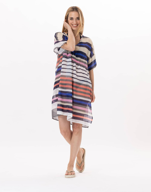 Sur un voile de coton au toucher tout doux et à l’effet crinkle, légèrement texturé et facile à entretenir, les rayures asymétriques et contrastées apportent juste ce qu'il faut de transparence aux kaftan VALLAURIS 940, robes VALLAURIS 941 et 942 et pantalon VALLAURIS 980 : vos must-haves légers et élégants de plage.