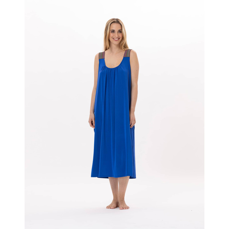 La robe longue PAMPELONNE peut se porter en sur-maillot de bain après une baignade ou même lors d'une escapade estivale, offrant un look féminin et lumineux.