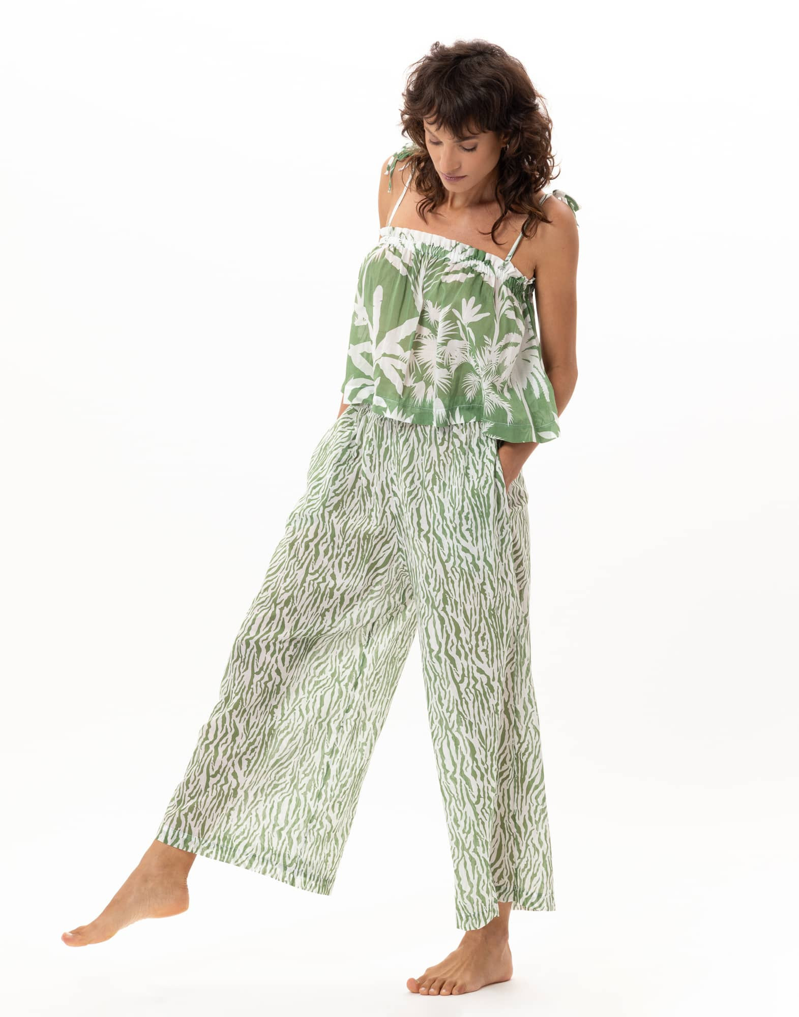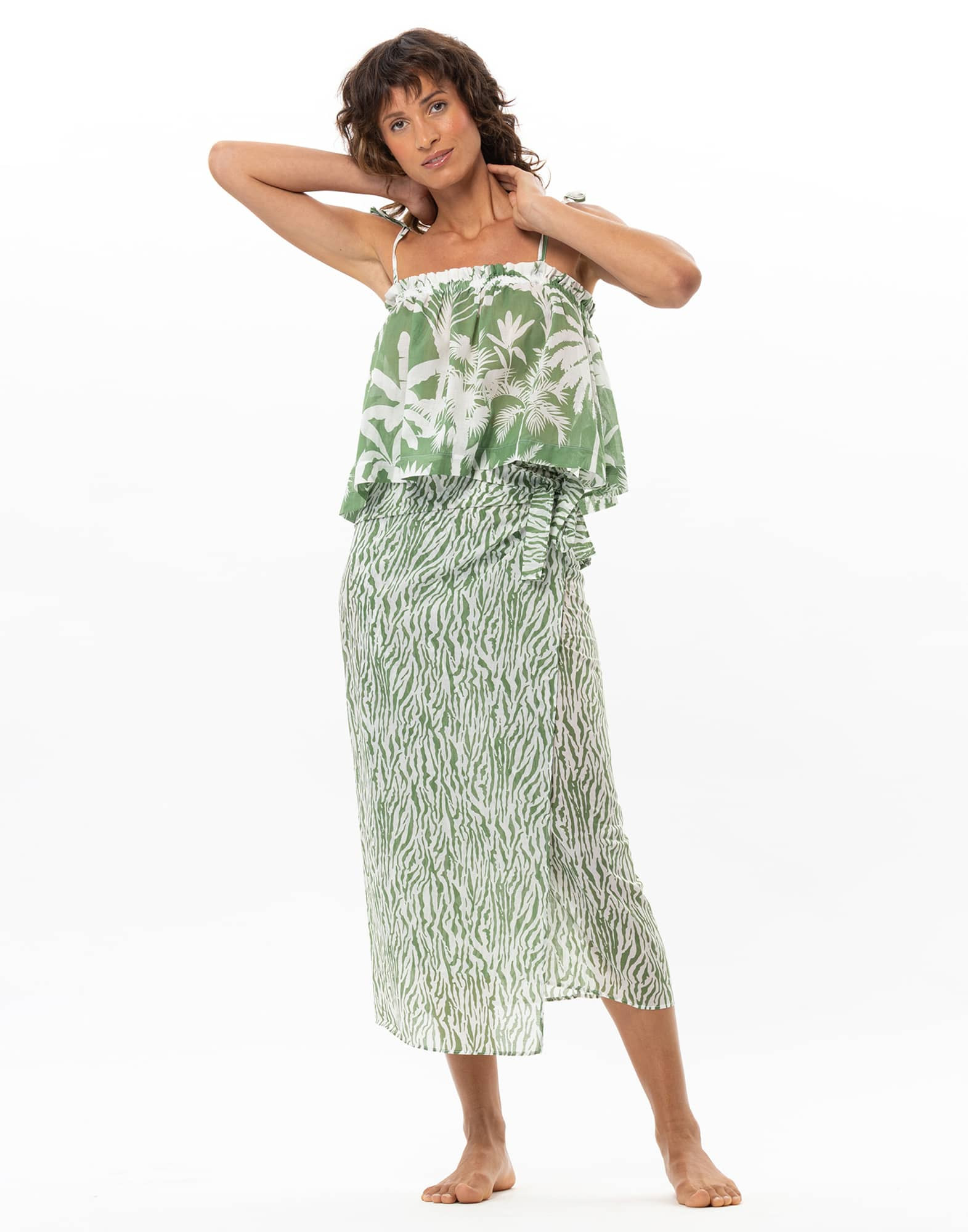 Disponible en imprimé feuillage ou zébré, présentant une subtile transparence et se répondant dans un doux jeu de contrastes : une des signatures de la capsule beachwear Le Jardin Aquatique.
