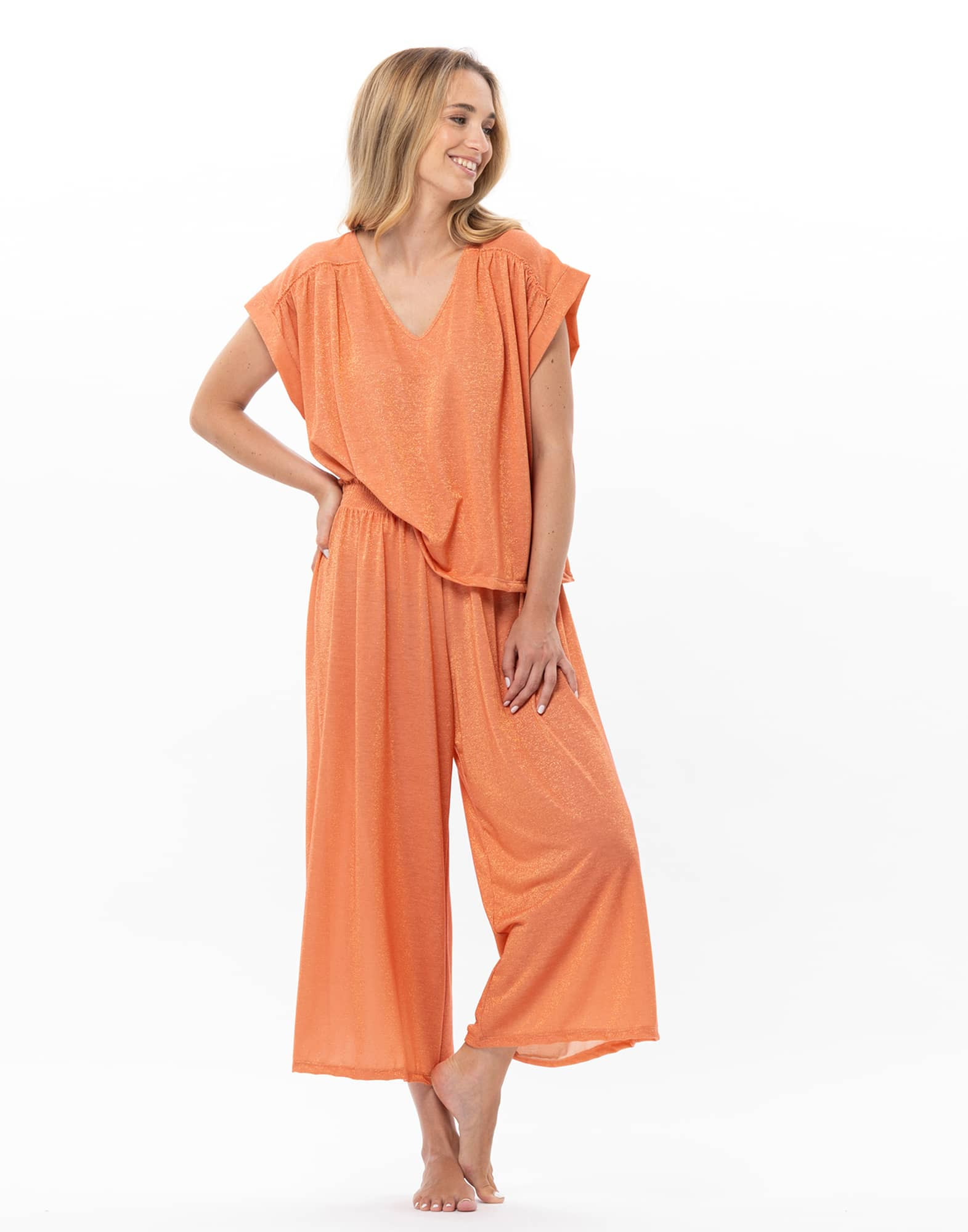 Confectionnée en Italie, sa maille se distingue par son éclat subtilement irisé apporté par de fins fils Lurex® qui captent la lumière. En abricot vitaminé ou en kaki végétal, le t-shirt Coco s’associe au pantalon Coco pour créer un total look estival.