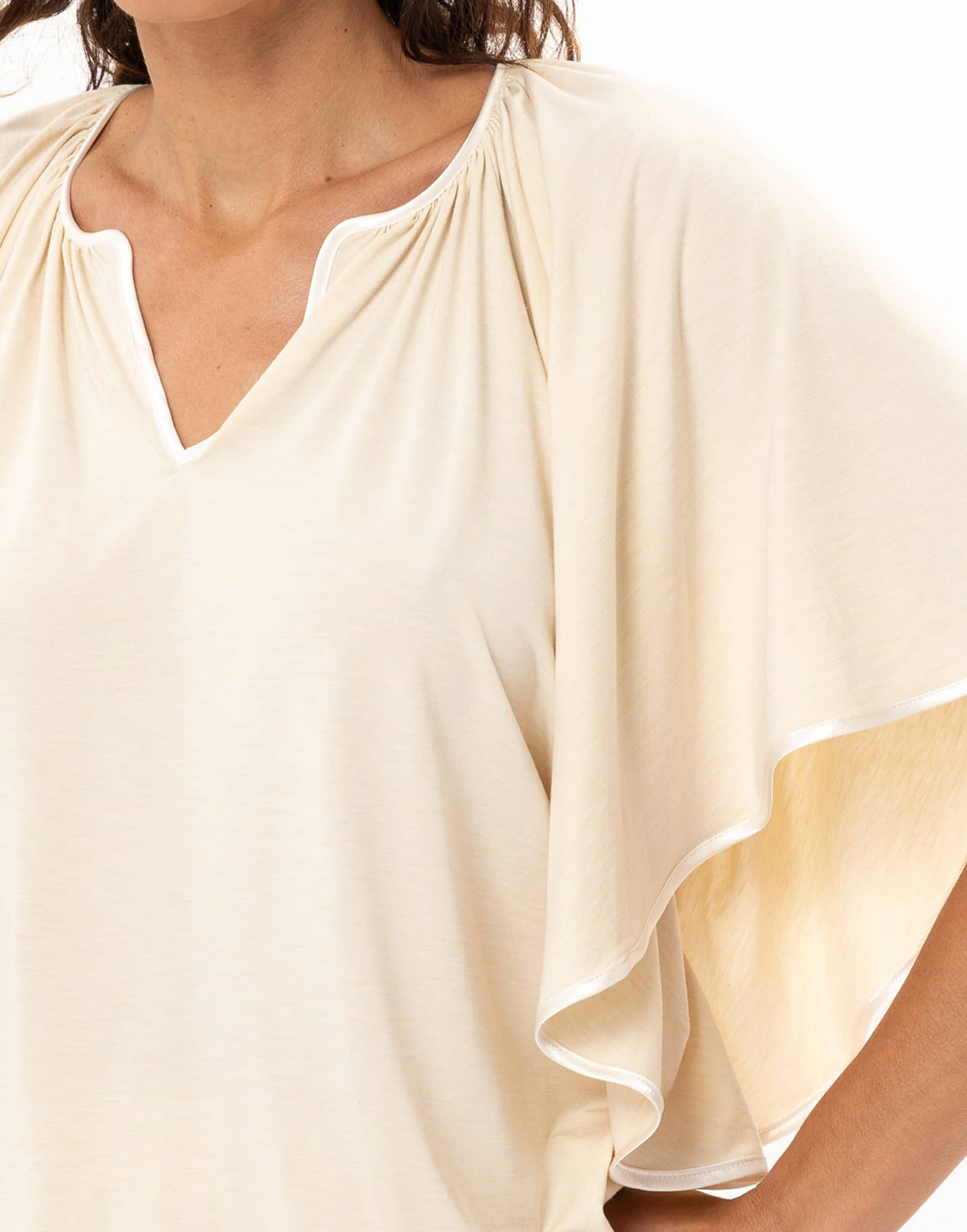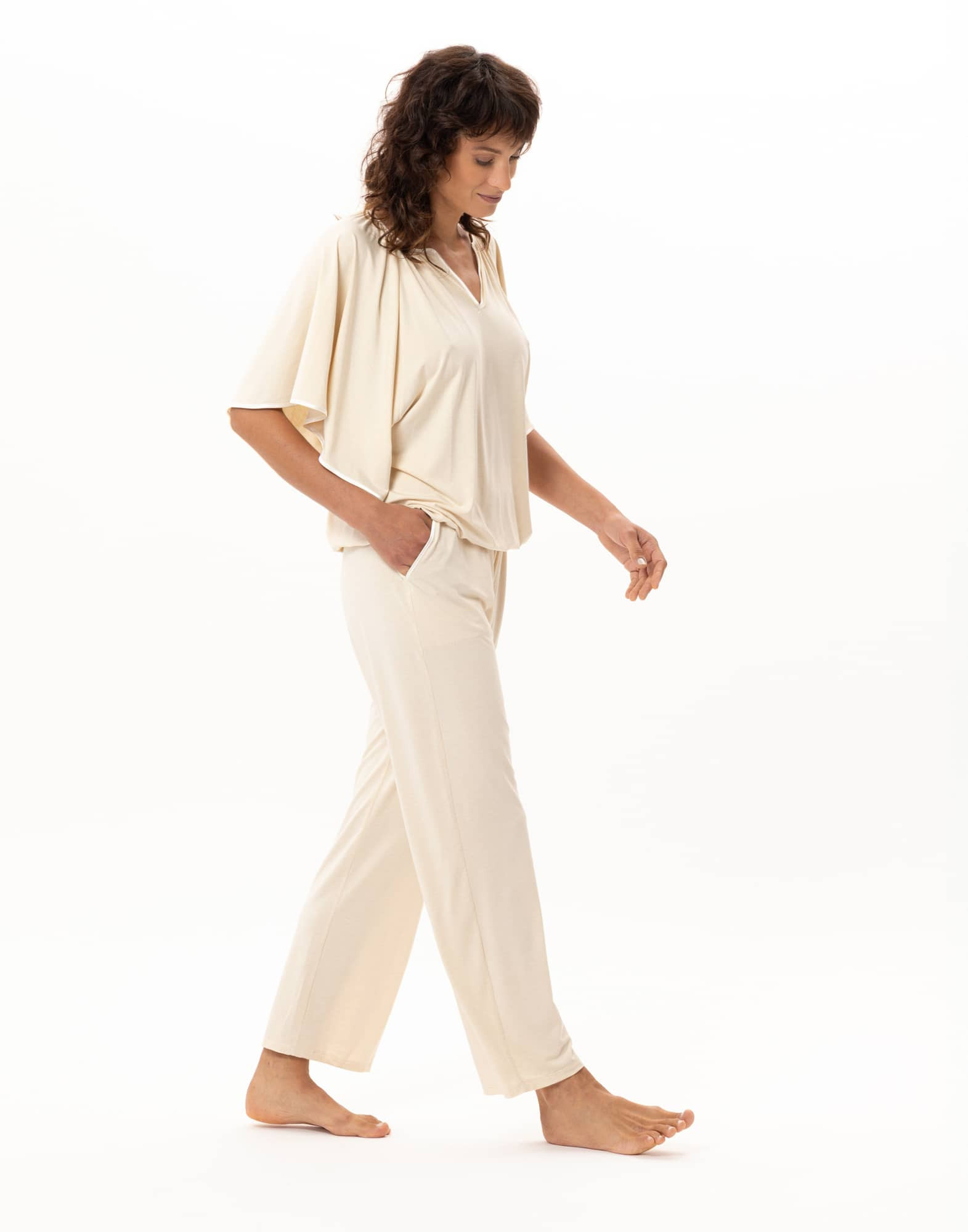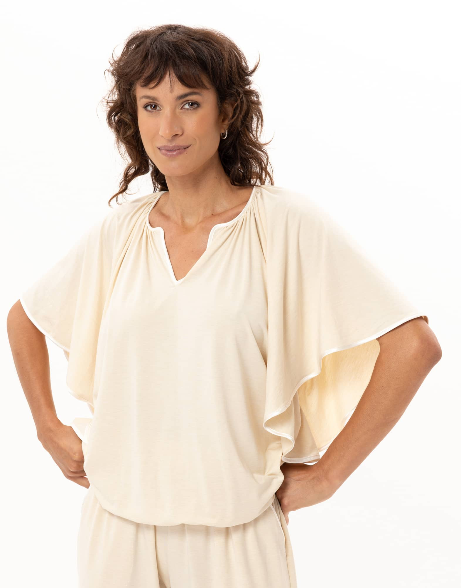 Le top aux volumes amples crée d’élégants mouvements. Ses manches larges façon papillon signent un look affirmé tout en fluidité. L’ensemble compose une silhouette à la fois décontractée et élégante, à porter chez soi comme en dehors.